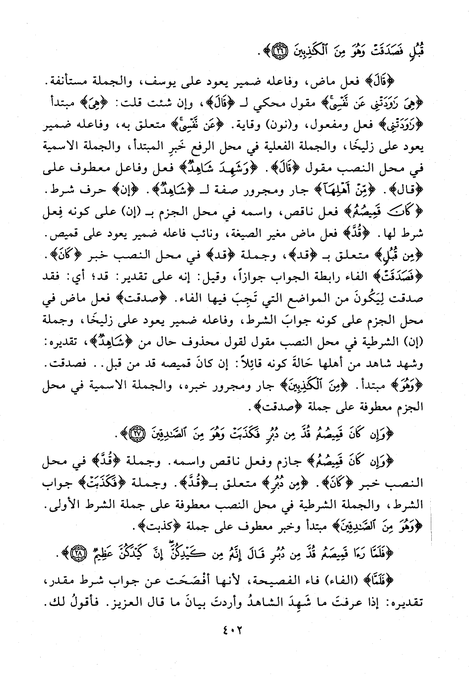 {وَإِنْ كَانَ قَمِيصُهُ} جازم وفعل ناقص واسمه. وجملة {قُدَّ} في محل النصب خبر {كَانَ}. {مِنْ دُبُر} متعلق بـ {قُدَّ}. وجملة {فَكَذَبَتْ} جواب الشرط، والجملة الشرطية في محل النصب معطوفة على جملة الشرط الأولى. {وَهُوَ مِنَ الصَّادِقِينَ} مبتدأ وخبر معطوف على جملة {كذبت}.
