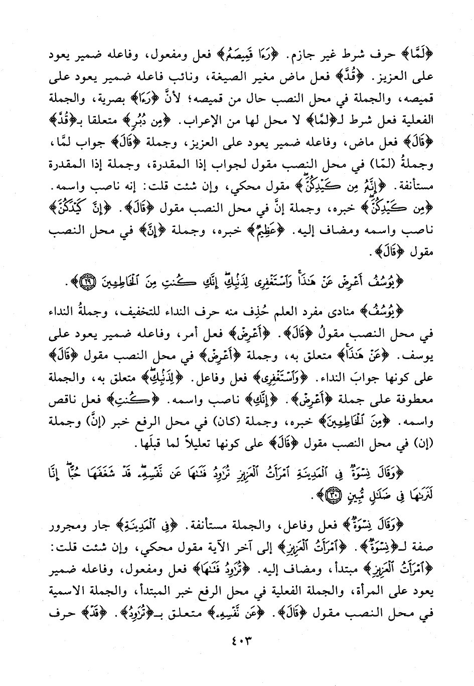 {يُوسُفُ} منادى مفرد العلم حُذِف منه حرف النداء للتخفيف، وجملةُ النداء في محل النصب مقولُ {قَالَ}. {أَعْرِضْ} فعل أمر، وفاعله ضمير يعود على يوسف. {عَنْ هَذَا} متعلق به، وجملة {أَعْرِضْ} في محل النصب مقول {قَالَ} على كونها جوابَ النداء. {وَاسْتَغْفِرِي} فعل وفاعل. {لِذَنْبِكِ} متعلق به، والجملة معطوفة على جملة {أَعْرِضْ}. {إِنَّكِ} ناصب واسمه. {كُنْتِ} فعل ناقص واسمه. {مِنَ الْخَاطِئِينَ} خبره، وجملة (كان) في محل الرفع خبر {إِنَّ} وجملة (إن) في محل النصب مقول {قَالَ} على كونها تعليلًا لما قبلَها.