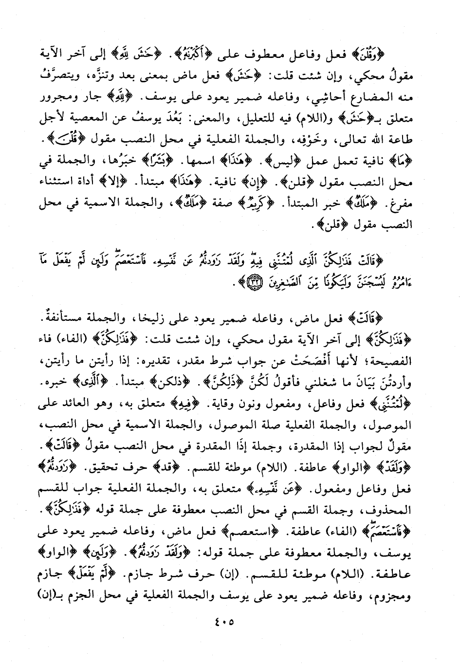 {قَالَتْ} فعل ماض، وفاعله ضمير يعود على زليخا، والجملة مستأنفةٌ. {فَذَلِكُنَّ} إلى آخر الآية مقول محكي، وإن شئت قلت: {فَذَلِكُنَّ} {الفاء} فاء الفصيحة؛ لأنها أَفْصَحَتْ عن جواب شرط مقدر، تقديره: إذا رأيتن ما رأيتن، وأردتُنَ بَيَانَ ما شغلني فأقولُ لَكُنَّ {ذَلِكُنَّ}. {ذلكن} مبتدأ. {الَّذِي} خبره. {لُمْتُنَّنِي} فعل وفاعل، وفعول ونون وقاية. {فِيهِ} متعلق به، وهو العائد على الموصول، والجملة الفعلية صلة الموصول، والجملة الاسمية في محل النصب، مقولٌ لجواب إذا المقدرة، وجملة إذَا المقدرة في محل النصب مقولُ {قَالَتْ}. {وَلَقَدْ} {الواو} عاطفة. {اللام} موطئة للقسم. {قد} حرف تحقيق. {رَاوَدْتُهُ} فعل وفاعل ومفعول. {عَنْ نَفْسِهِ} هو متعلق به، والجملة الفعلية جواب للقسم المحذوف، وجملة القسم في محل النصب معطوفة على جملة قوله {فَذَلِكُنَّ}. {فَاسْتَعْصَمَ} {الفاء} عاطفة. {استعصم} فعل ماض، وفاعله ضمير يعود على يوسف , والجملة معطوفة على جملة قوله: {وَلَقَدْ رَاوَدْتُهُ} {وَلَئِنْ} {الواو} عاطفة. {اللام} موطئة للقسم. {إن} حرف شرط جازم. {لَمْ يَفْعَلْ} جازم ومجزوم، وفاعله ضمير يعود على يوسف والجملة الفعلية في محل الجزم بـ {إن}