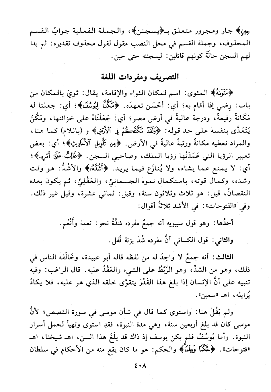 {مَثْوَاهُ} المثوى: اسم لمكان الثواء والإقامة، يقال: ثويَ بالمكان من باب: رِضي إذا أقام به؛ أي: أحْسَن تعهدَه. {مَكَّنَّا لِيُوسُفَ}؛ أي: جعلنا له مَكَانةً رفيعةً، ودرجة عاليةً في أرض مصر؛ أي: جَعَلْنَاهُ على خزائنها، ومَكَّنَ يَتَعَدَّى بنفسه على حد قوله: {وَلَقَدْ مَكَّنَّاكُمْ فِي الْأَرْضِ} و (باللام) كما هنا، والمراد نعطيه مكانةً ورتبةً عاليةً في الأرض. {مِنْ تَأْوِيلِ الْأَحَادِيثِ}؛ أي: بعض تعبير الرؤيا التي عَمَدَتْها رؤيا الملك، وصاحبي السجن. {غَالِبٌ عَلَى أَمْرِهِ}؛ أي: لا يمنع عما يشاء، ولا يُنازَع فيما يريد. {أَشُدَّهُ} والأشُدُّ: هو وقت رشده، وكمال قوته، باستكمال نموه الجسمانيِّ، والعَقْلِيِّ، ثم يكون بعده النقصانُ، قيل: هو ثلاث وثلاثون سنة، وقيل: ثماني عشرة، وقيل غير ذلك. وفي "الفتوحات": في الأشد ثلاثةُ أقوال: