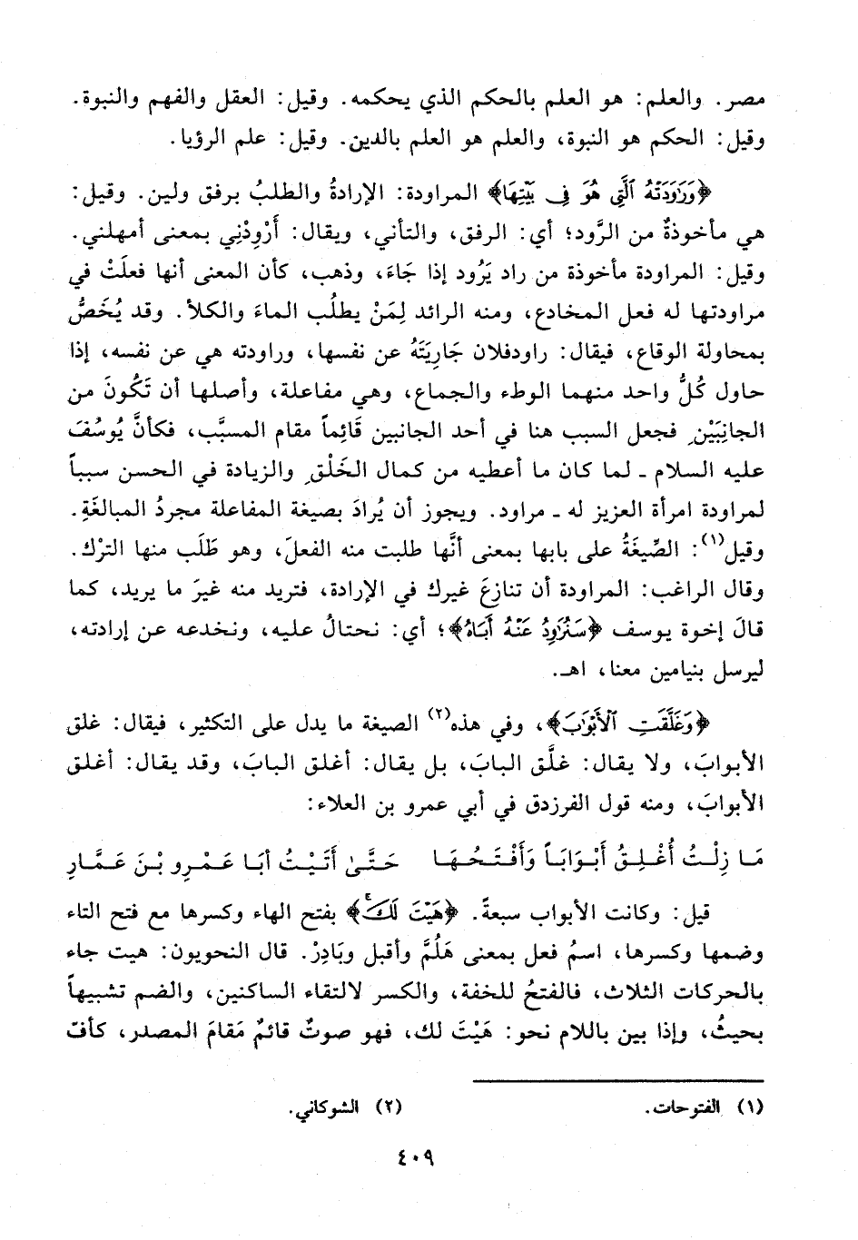 {وَرَاوَدَتْهُ الَّتِي هُوَ فِي بَيْتِهَا} المراودة: الإرادةُ والطلبُ برفق ولين. وقيل: هي مأخوذةٌ من الرَّود؛ أي: الرفق، والتأني، ويقال: أَرْوِدْنِي بمعنى أمهلني. وقيل: المراودة مأخوذة من راد يَرُود إذا جَاءَ، وذهب، كأن المعنى أنها فعلَتْ في مراودتها له فعل المخادع، ومنه الرائد لِمَنْ يطلُب الماءَ والكلأ. وقد يُخَصُّ بمحاولة الوقاع، فيقال: راود فلان جَارِيتَهُ عن نفسها، وراودته هي عن نفسه، إذا حاول كُلُّ واحد منهما الوطء والجماع، وهي مفاعلة، وأصلها أن تَكونَ من الجانِبَيْنِ فجعل السبب هنا في أحد الجانبين قَائِمًا مقام المسبَّب، فكأنَّ يُوسُفَ عليه السلام - لما كان ما أعطيه من كمال الخَلْقِ والزيادة في الحسن سببًا لمراودة امرأة العزيز له - مراود. ويجوز أن يُرادَ بصيغة المفاعلة مجردُ المبالغَةِ. وقيل (¬1): الصِّيغَةُ على بابها بمعنى أنَّها طلبت منه الفعلَ، وهو طَلَب منها الترْك، وقال الراغب: المراودة أن تنازعَ غيرك في الإرادة، فتريد منه غيرَ ما يريد، كما قالَ إخوة يوسف {سَنُرَاوِدُ عَنْهُ أَبَاهُ}؛ أي: نحتالُ عليه، ونخدعه عن إرادته، ليرسل بنيامين معنا، اهـ.