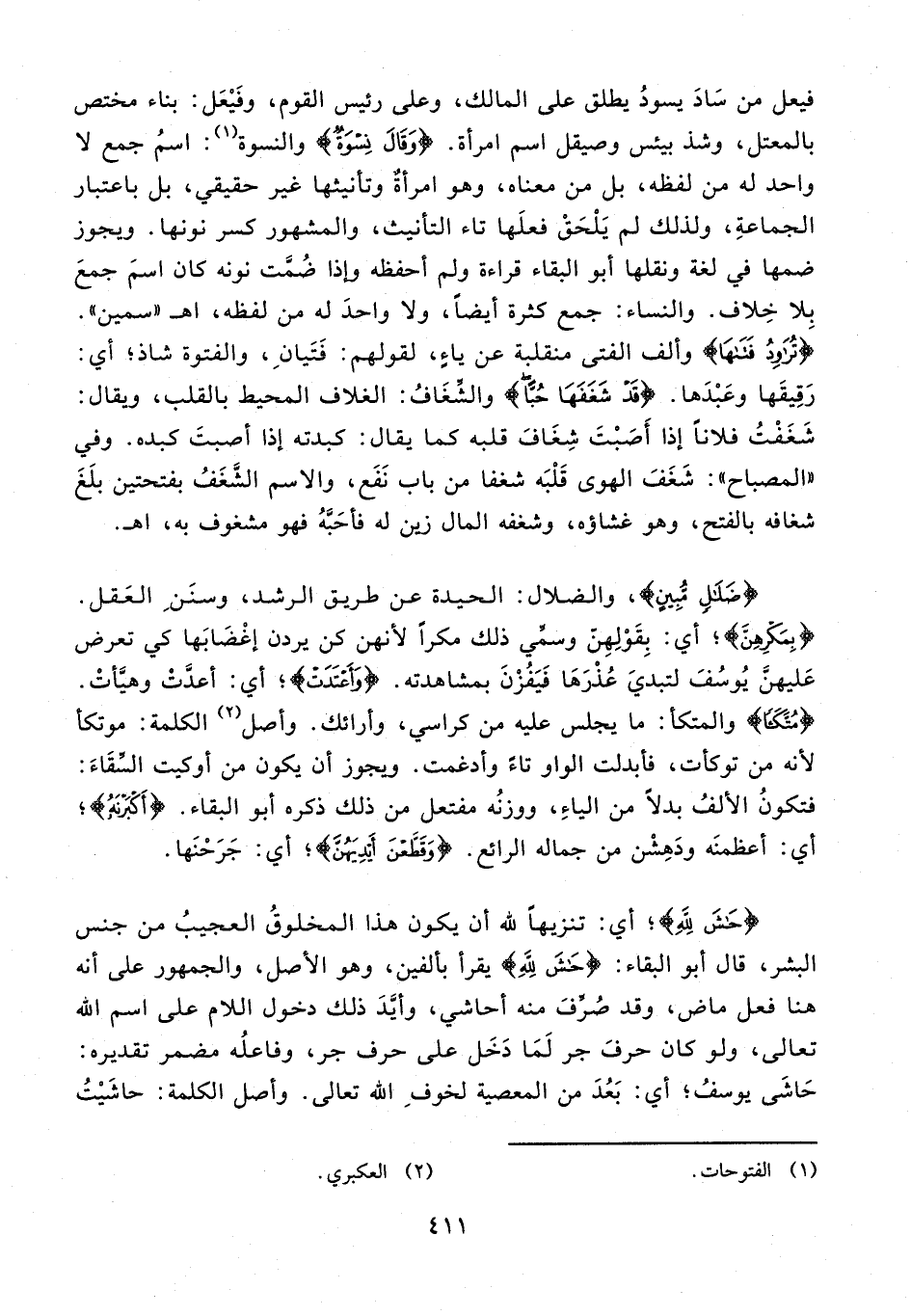 {ضَلَالٍ مُبِينٍ}، والضلال: الحيدة عن طريق الرشد، وسنَنِ العَقل. {بِمَكْرِهِنَّ}؛ أي: بِقَوْلِهِنّ وسمِّي ذلك مكرًا لأنهن كن يردن إغْضَابَها كي تعرض عَليهنَّ يُوسُفَ لتبديَ عُذْرَهَا فَيَفُزْنَ بمشاهدته. {وَأَعْتَدَتْ}؛ أي: أعدَّتْ وهيَّأتْ. {مُتَّكَأً} والمتكأ: ما يجلس عليه من كراسي، وأرائك. وأصل (¬2) الكلمة: موتكأ لأنه من توكأت، فأبدلت الواو تاءً وأدغمت. ويجوز أن يكون من أوكيت السِّقَاءَ: فتكونُ الألفُ بدلًا من الياءِ, ووزنُه مفتعل من ذلك ذكره أبو البقاء. {أَكْبَرْنَهُ}؛ أي: أعظمنَه ودَهِشْن من جماله الرائع. {وَقَطَّعْنَ أَيْدِيَهُنَّ}؛ أي: جَرَحْنَها.