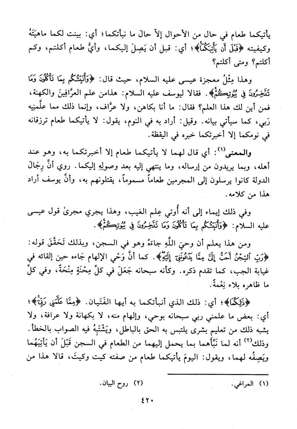 والمعنى (¬1): أي قال لهما لا يأتيكما طعام إلا أخبرتكما به، وهو عند أهله، وبما يريدون من إرساله، وما ينتهي إليه بعد وصولِهِ إليكما. روي أنَّ رِجَالَ الدولة كانوا يرسلون إلى المجرمين طعامًا مسمومًا، يقتلونهم به، وأنَّ يوسف أراد هذا من كلامه.