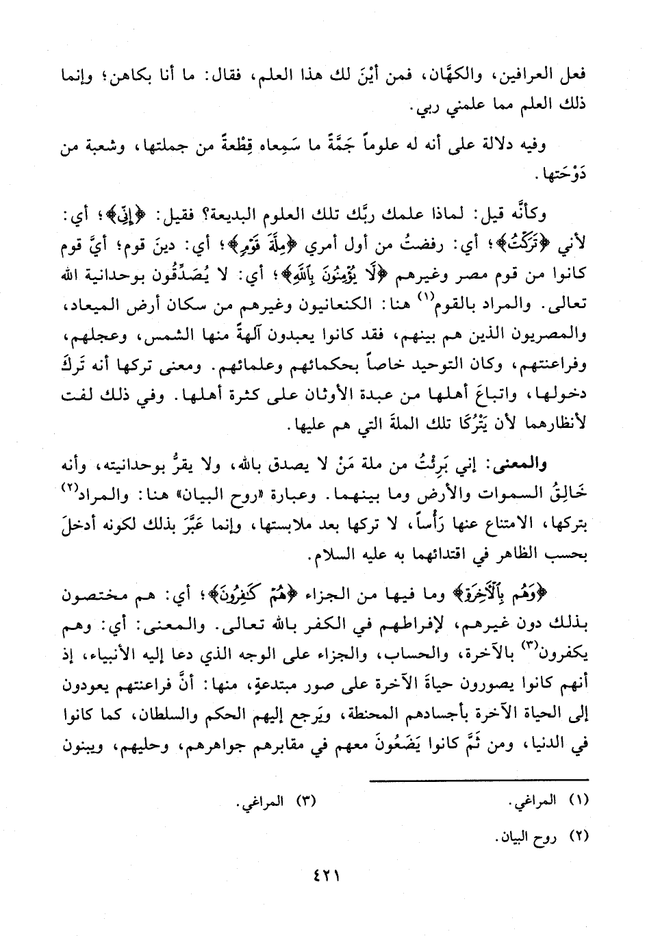 وكأنَّه قيل: لماذا علمك ربُّك تلك العلوم البديعة؟ فقيل: {إِنِّي}؛ أي: لأني {تَرَكْتُ}؛ أي: رفضتُ من أول أمري {مِلَّةَ قَوْمٍ}؛ أي: دينَ قوم؛ أيَّ قوم كانوا من قوم مصر وغيرهم {لَا يُؤْمِنُونَ بِاللَّهِ}؛ أي: لا يُصَدِّقُون بوحدانية الله تعالى. والمراد بالقوم (¬1) هنا: الكنعانيون وغيرهم من سكان أرض الميعاد، والمصريون الذين هم بينهم، فقد كانوا يعبدون آلهةً منها الشمس، وعجلهم، وفراعنتهم، وكان التوحيد خاصًّا بحكمائهم وعلمائهم. ومعنى تركها أنه تَركَ دخولها، واتباعَ أهلها من عبدة الأوثان على كثرة أهلها. وفي ذلك لفت لأنظارهما لأن يَتْرُكَا تلك الملةَ التي هم عليها.