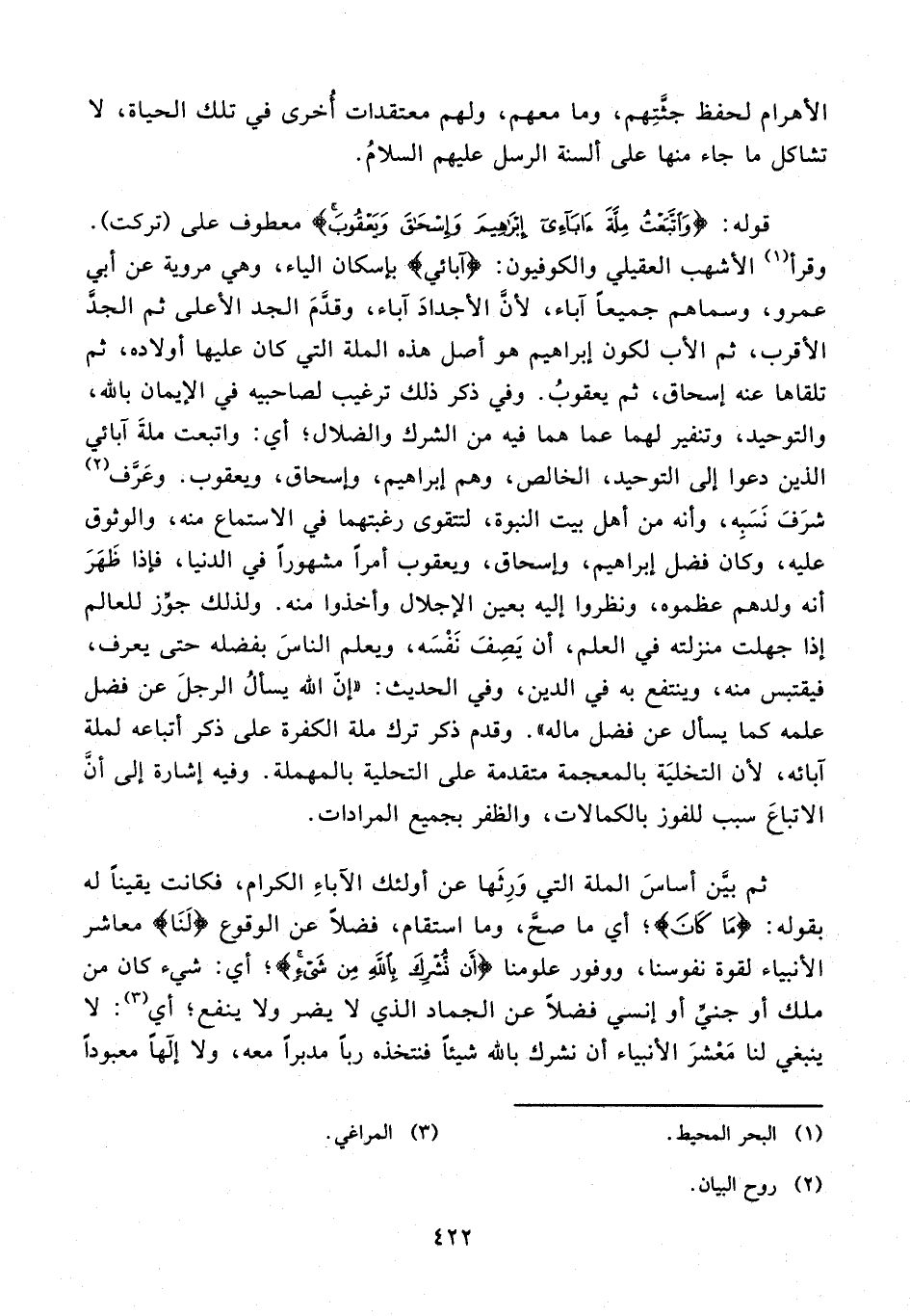 38 - قوله: {وَاتَّبَعْتُ مِلَّةَ آبَائِي إِبْرَاهِيمَ وَإِسْحَاقَ وَيَعْقُوبَ} معطوف على (تركت). وقرأ (¬1) الأشهب العقيلي والكوفيون: {آبائي} بإسكان الياء، وهي مروية عن أبي عمرو، وسماهم جميعًا آباء؛ لأنَّ الأجدادَ آباء، وقدَّمَ الجد الأعلى ثم الجدَّ الأقرب، ثم الأب لكون إبراهيم هو أصل هذه الملة التي كان عليها أولاده، ثم تلقاها عنه إسحاق، ثم يعقوبُ. وفي ذكر ذلك ترغيب لصاحبيه في الإيمان بالله، والتوحيد، وتنفير لهما عما هما فيه من الشرك والضلال؛ أي: واتبعت ملةَ آبائي الذين دعوا إلى التوحيد، الخالص، وهم إبراهيم، وإسحاق، ويعقوب. وعَرَّف (¬2) شرَفَ نَسَبِه، وأنه من أهل بيت النبوة، لتتقوى رغبتهما في الاستماع منه، والوثوق عليه، وكان فضل إبراهيم، وإسحاق، ويعقوب أمرًا مشهورًا في الدنيا، فإذا ظَهَرَ أنه ولدهم عظموه، ونظروا إليه بعين الإجلال وأخذوا منه. ولذلك جوِّز للعالم إذا جهلت منزلته في العلم، أن يَصِفَ نَفْسَه، ويعلم الناسَ بفضله حتى يعرف، فيقتبس منه، وينتفع به في الدين، وفي الحديث: "إنّ الله يسألُ الرجلَ عن فضل علمه كما يسأل عن فضل ماله". وقدم ذكر ترك ملة الكفرة على ذكر أتباعه لملة آبائه, لأن التخليَة بالمعجمة متقدمة على التحلية بالمهملة. وفيه إشارة إلى أنَّ الاتباعَ سبب للفوز بالكمالات، والظفر بجميع المرادات.
