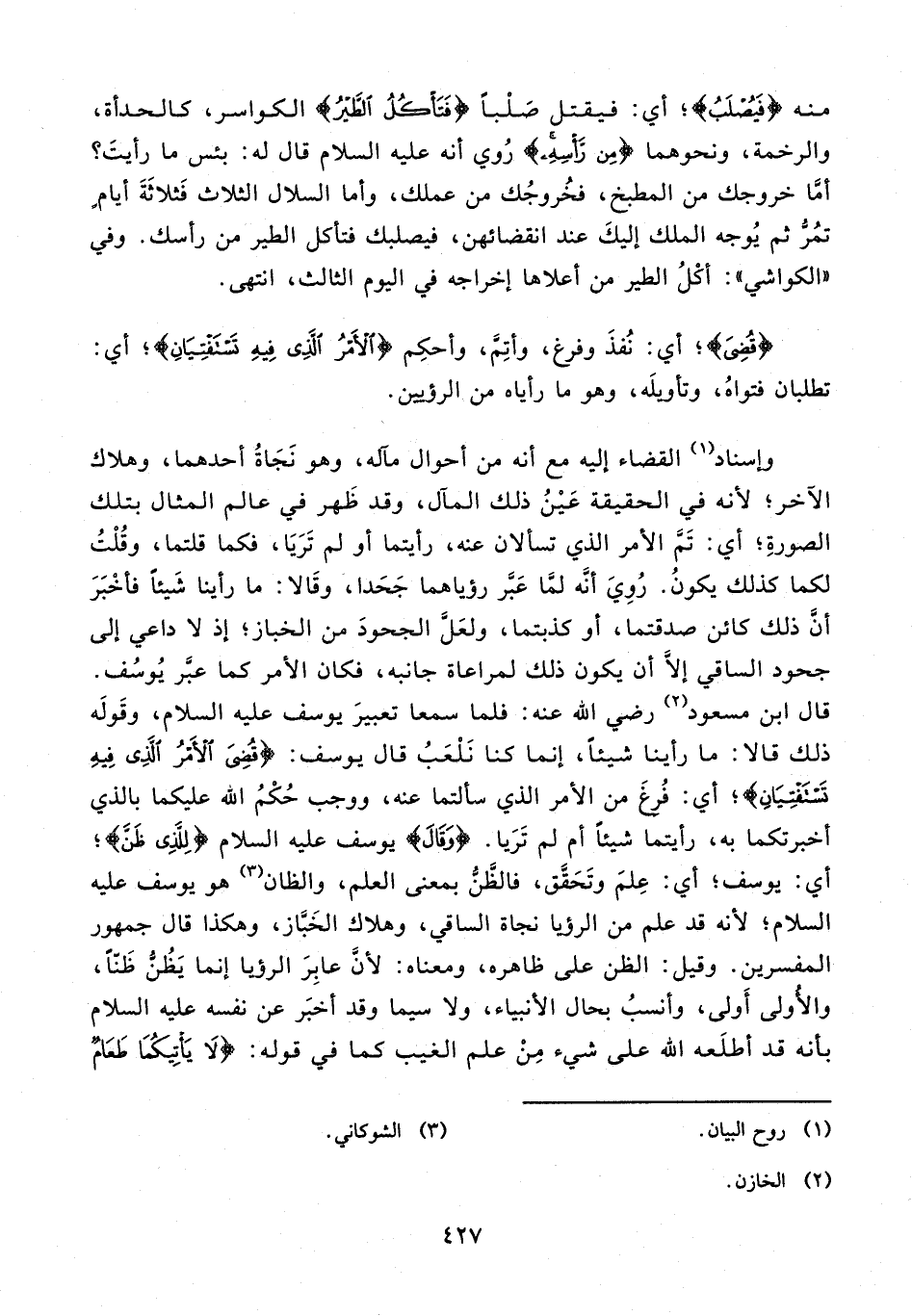 وإسناد (¬1) القضاء إليه مع أنه من أحوال مآله، وهو نَجَاةُ أحدهما، وهلاك الآخر؛ لأنه في الحقيقة عَيْنُ ذلك المآل، وقد ظَهر في عالم المثال بتلك الصورةِ؛ أي: تَمَّ الأمر الذي تسألان عنه، رأيتما أو لم تَرَيَا، فكما قلتما، وقُلْتُ لكما كذلك يكونُ. رُوِيَ أنَّه لمَّا عَبَّر رؤياهما جَحَدا، وقَالا: ما رأينا شَيئًا فأخْبَرَ أنَّ ذلك كائن صدقتما، أو كذبتما, ولعَلَّ الجحودَ من الخباز؛ إذ لا داعي إلى جحود الساقي إلَّا أن يكون ذلك لمراعاة جانبه، فكان الأمر كما عبَّر يُوسُف. قال ابن مسعود (¬2) رضي الله عنه: فلما سمعا تعبيرَ يوسف عليه السلام، وقَولَه ذلك قالا: ما رأينا شيئًا، إنما كنا نَلْعَبُ قال يوسف: {قُضِيَ الْأَمْرُ الَّذِي فِيهِ تَسْتَفْتِيَانِ}؛ أي: فُرغَ من الأمر الذي سألتما عنه، ووجب حُكْمُ الله عليكما بالذي أخبرتكما به، رأيتما شيئًا أم لم تَرَيا.