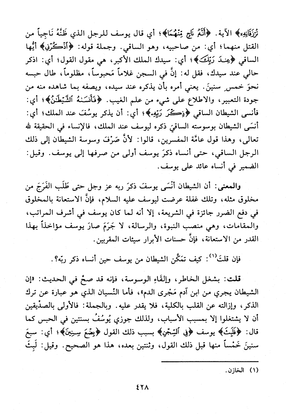 والمعنى: أن الشيطان أنْسَى يوسفَ ذكرَ ربه عَزَّ وَجَلَّ حتى طَلَب الفَرَجَ من مخلوق مثله، وتلك غفلة عرضت ليوسف عليه السلام، فإنَّ الاستعانة بالمخلوق في دفع الضرر جائزة في الشريعة، إلا أنه لما كان يوسف في أشرف المراتب، والمقامات، وهي منصب النبوة، والرسالة، لا جَرَمَ صارَ يوسف مؤاخذًا بهذا القدر من الاستعانة، فإنَّ حسنات الأبرار سيئات المقربين.