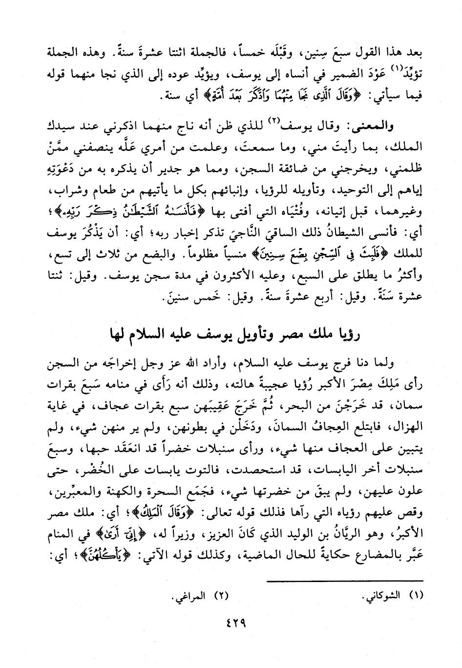 43 - ولما دنا فرج يوسف عليه السلام، وأراد الله عَزَّ وَجَلَّ إخراجَه من السجن رأى مَلِكَ مِصْرَ الأكبر رُؤيا عجيبةً هالته، وذلك أنه رَأَى في منامه سَبعَ بقرات سمان، قد خَرَجْنَ من البحر، ثُمَّ خَرَجَ عَقِيبَهن سبع بقرات عجاف، في غاية الهزال، فابتلع العِجافُ السمانَ، ودَخَلْن في بطونهن، ولم ير منهن شيء، ولم يتبين على العجاف منها شيء، ورأى سنبلات خضرًا قد انعَقَد حبها، وسبعَ سنبلات أخر اليابسات، قد استحصدت، فالتوت يابسات على الخُضْر، حتى علون عليهن، ولم يبقَ من خضرتها شيء، فجَمَع السحرة والكهنة والمعبّرين، وقص عليهم رؤياه التي رآها فذلك قوله تعالى: {وَقَالَ الْمَلِكُ}؛ أي: ملك مصر الأكبرُ، وهو الريَّانُ بن الوليد الذي كَانَ العزيز، وزيرًا له، {إِنِّي أَرَى} في المنام عَبَّر بالمضارع حكايةً للحال الماضية، وكذلك قوله الآتي: {يَأْكُلُهُنَّ}؛ أي: