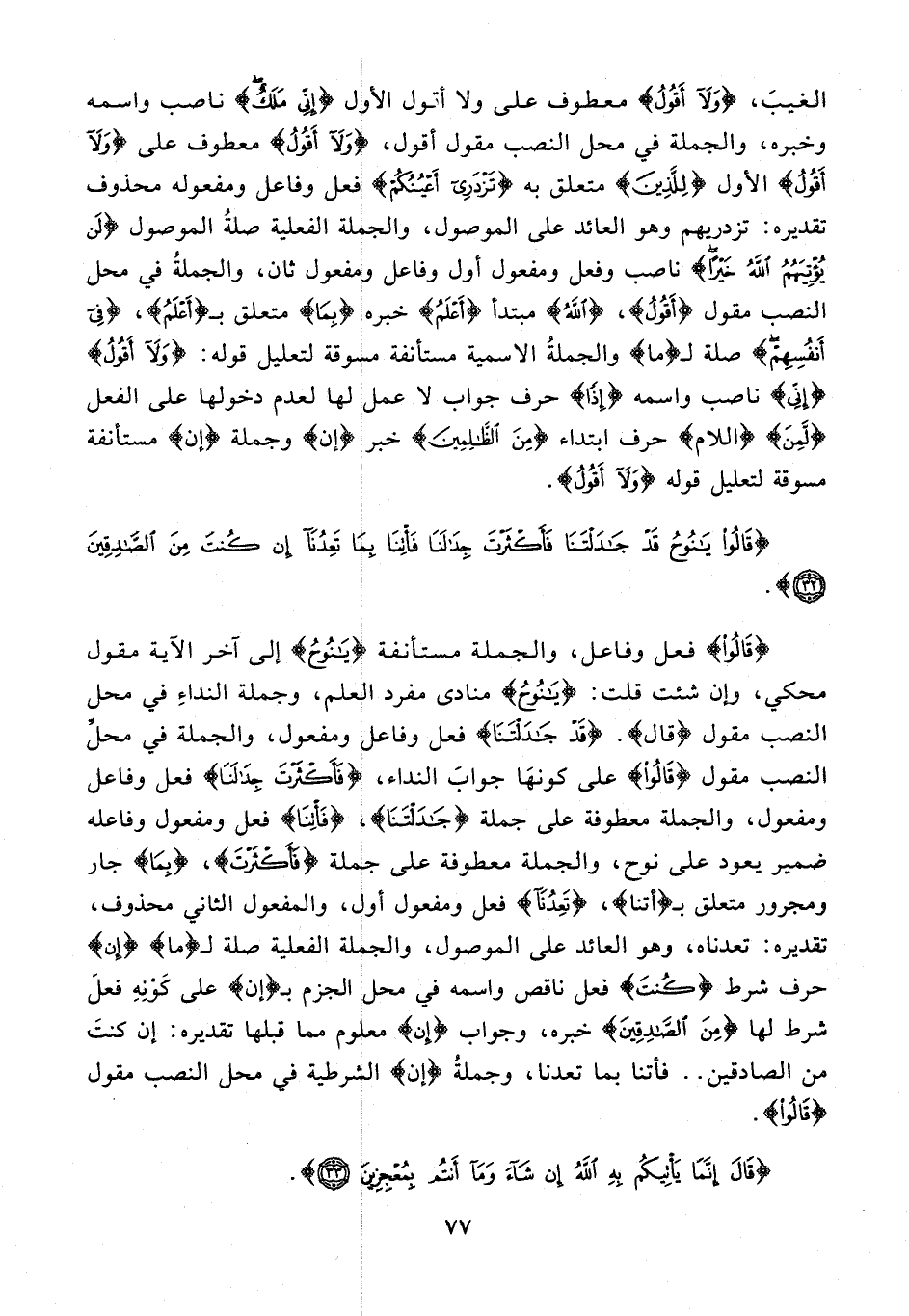 {قَالُوا} فعل وفاعل، والجملة مستأنفة {يَا نُوحُ} إلى آخر الآية مقول محكي، وإن شئت قلت: {يَا نُوحُ} منادى مفرد العلم، وجملة النداءِ في محل النصب مقول {قال}. {قَدْ جَادَلْتَنَا} فعل وفاعل ومفعول، والجملة في محلِّ النصب مقول {قَالُوا} على كونهَا جوابَ النداء، {فَأَكْثَرْتَ جِدَالَنَا} فعل وفاعل ومفعول، والجملة معطوفة على جملة {جَادَلْتَنَا}، {فَأْتِنَا} فعل ومفعول وفاعله ضمير يعود على نوح، والجملة معطوفة على جملة {فَأَكْثَرْتَ}، {بِمَا} جار ومجرور متعلق بـ {أتنا}، {تَعِدُنَا} فعل ومفعول أول، والمفعول الثاني محذوف، تقديره: تعدناه، وهو العائد على الموصول، والجملة الفعلية صلة لـ {ما} {إن} حرف شرط {كُنْتَ} فعل ناقص واسمه في محل الجزم بـ {إن} على كَوْنِهِ فعلَ شرط لها {مِنَ الصَّادِقِينَ} خبره، وجواب {إِن} معلوم مما قبلها تقديره: إن كنتَ من الصادقين .. فأتنا بما تعدنا، وجملةُ {إن} الشرطية في محل النصب مقول {قَالُوا}.
