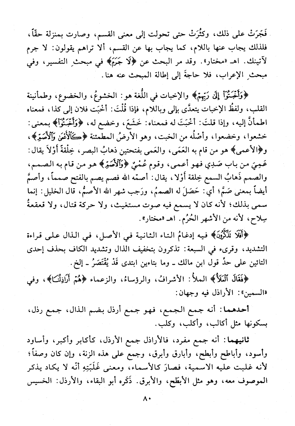 {وَأَخْبَتُوا إِلَى رَبِّهِمْ} والإخبات في اللُّغة هو: الخشوعُ، والخضوع، وطمأنينة القلب، ولفظُ الإخبات يتعدَّى بإلى وباللام، فإذا قُلْتَ: أخْبَت فلان إلى كذا، فمعناه اطمأنَّ إليه، وإذا قلتَ: أخْبَتَ له فمعناه: خَشَعَ، وخضع له، {وَأَخْبَتُوا} بمعنى: خشعوا، وخضعوا، وأصْلُه من الخبت، وهو الأرضُ المطمئنة {كَالْأَعْمَى وَالْأَصَمِّ}، و {الأعمى} هو من قام به العَمَى، والعَمى بفتحتين ذهابُ البصر، خِلْقةً أوْ لاَ يقال: عَمِيَ من باب صَدِي فهو أعمى، وقوم عُمْيٌ {وَالْأَصَمِّ} هو من قام به الصمم، والصمم ذَهابُ السمع خِلقة أَوْ لا، يقال: أصمّه الله فصم يصم بالفتح صممًا، وأصمَّ أيضًا بمعنى صَمَّ؛ أي: حَصَلَ له الصممُ، ورَجب شهر الله الأصمُّ، قال الخليل: إنما سمى بذلك؛ لأنه كان لا يسمع فيه صوت مستغيث، ولا حركة قتال، ولا قعقعةُ سِلاح, لأنه من الأشهر الحُرُم. اهـ "مختار".