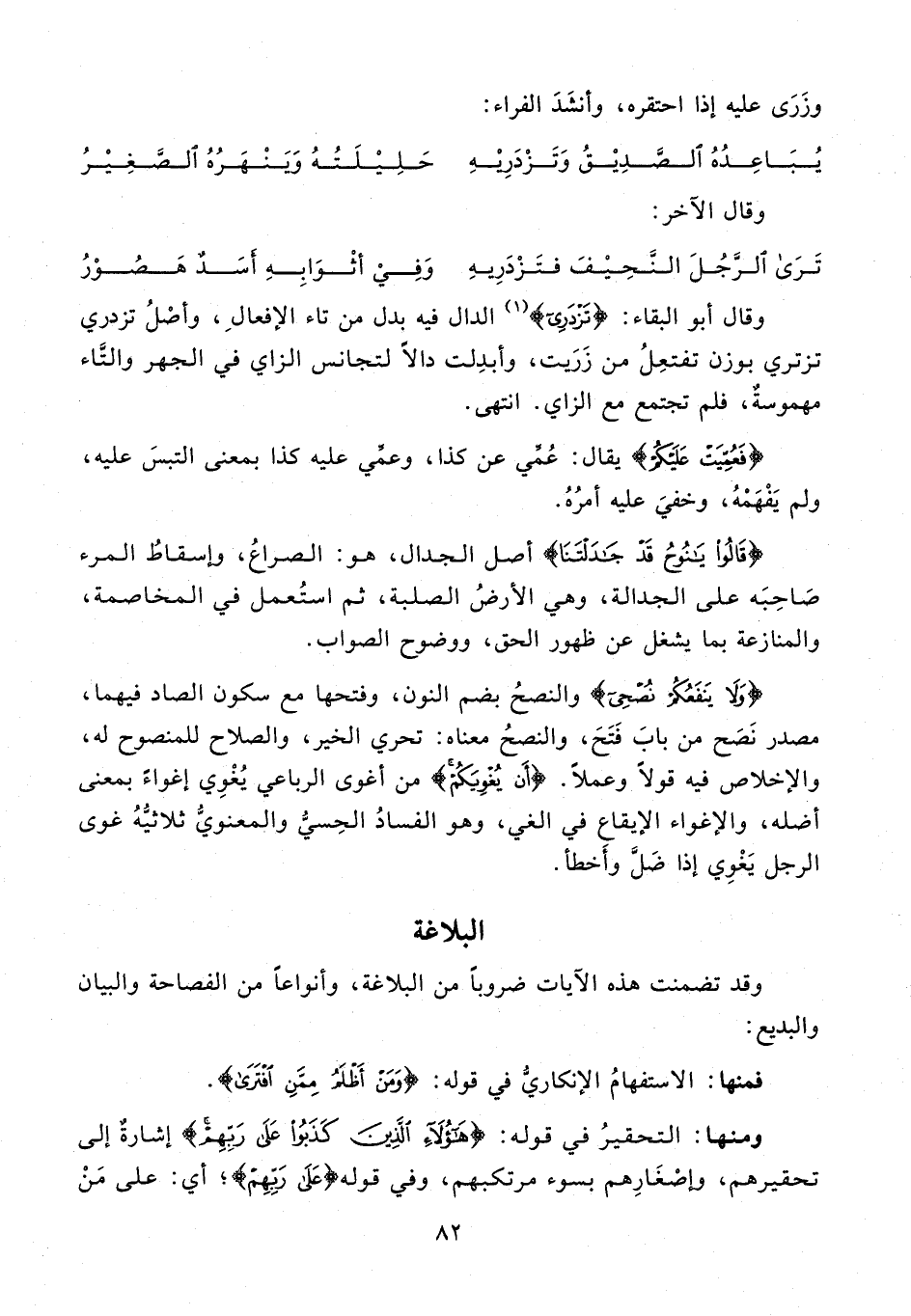 وقال أبو البقاء: {تَزْدَرِي} (1) الدال فيه بدل من تاء الإفعالِ، وأصْلُ تزدري تزتري بوزن تفتعِلُ من زَرَيت، وأبدِلت دالًا لتجانس الزاي في الجهر والتَّاء مهموسةٌ، فلم تجتمع مع الزاي. انتهى.
