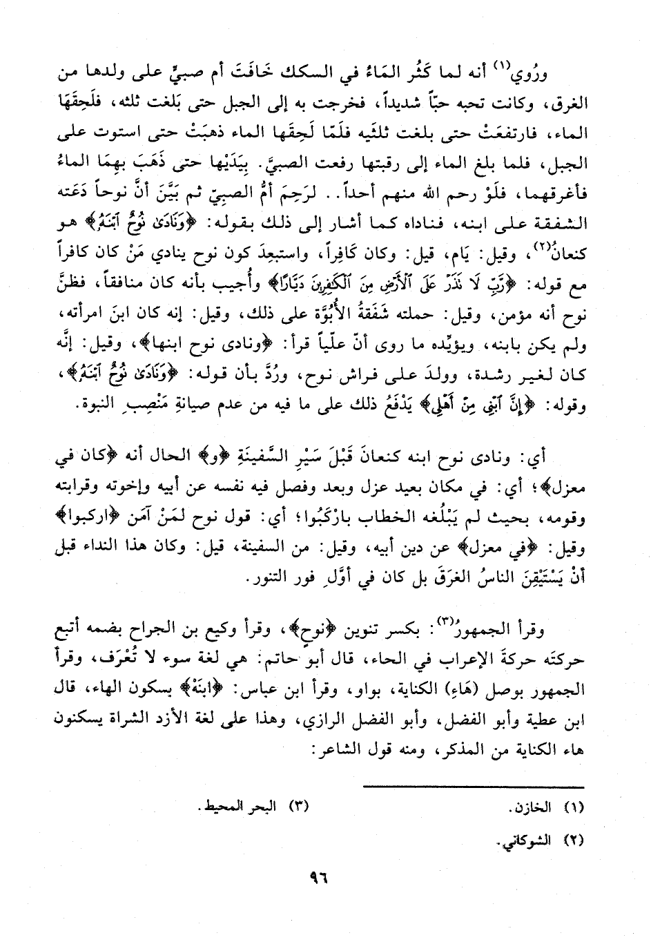وقرأ الجمهورُ (¬3): بكسر تنوين {نوحٍ}، وقرأ وكيع بن الجراح بضمه أتبع حركتَه حركةَ الإعراب في الحاء، قال أبو حاتم: هي لغة سوء لا تُعْرَف، وقرأ الجمهور بوصل (هَاءِ) الكناية، بواو، وقرأ ابن عباس: {ابنَهْ} بسكون الهاء، قال ابن عطية وأبو الفضل، وأبو الفضل الرازي، وهذا على لغة الأزد الشراة يسكنون هاء الكناية من المذكر، ومنه قول الشاعر: