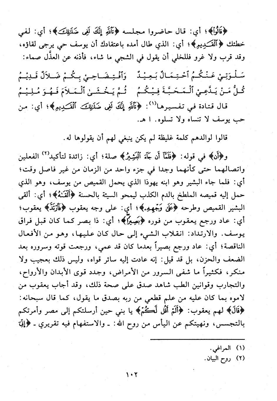 95 - {قَالُوا}؛ أي: قال حاضروا مجلسه {تَاللَّهِ إِنَّكَ لَفِي ضَلَالِكَ}؛ أي: لفي خطئك {الْقَدِيمِ}؛ أي: الذي طال أمده باعتقادك أن يوسف حي يرجى لقاؤه، وقد قرب ولا غرو فللخلي أن يقول في الشجي ما شاء، فأذنه عن العذَّل صماء: