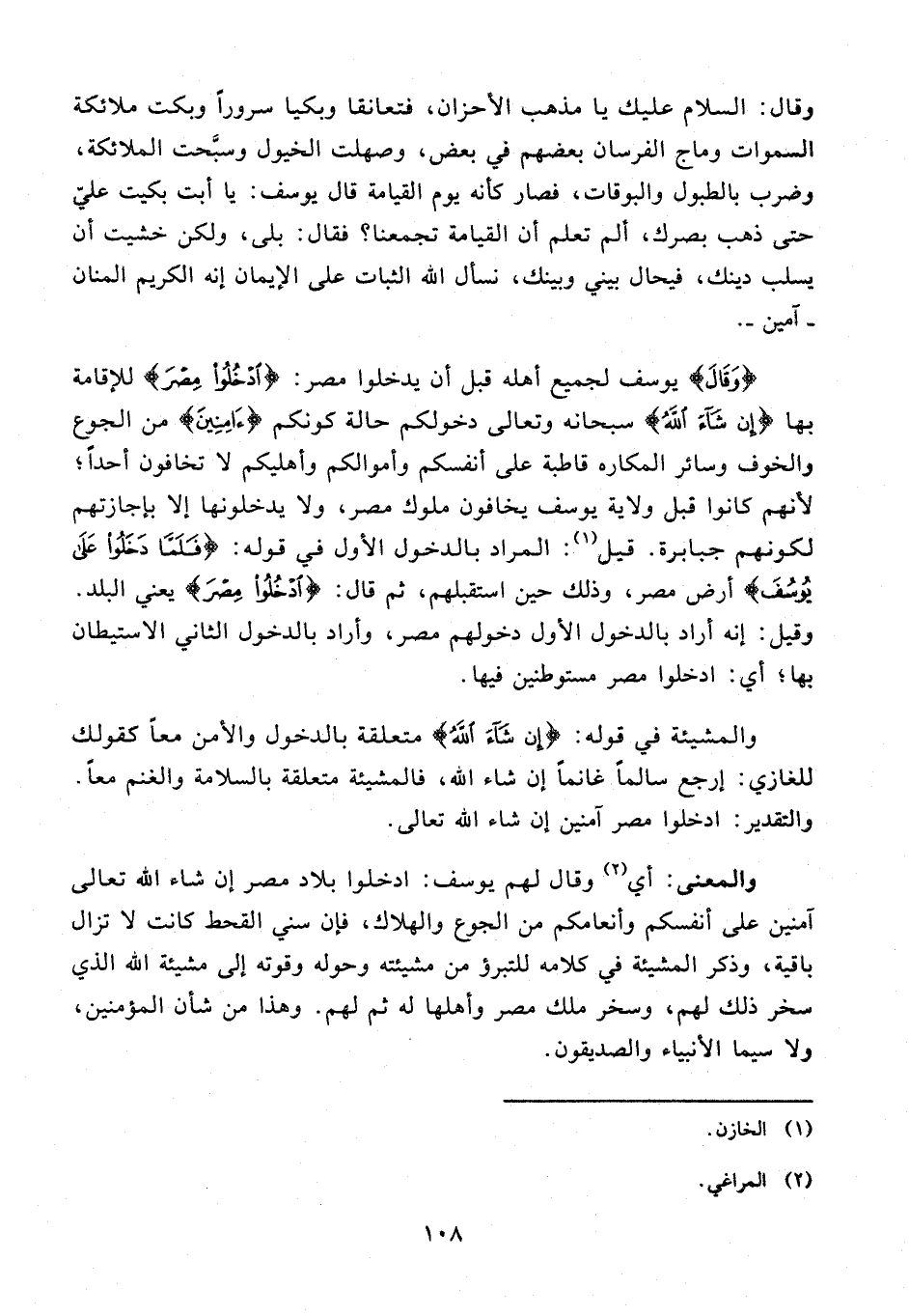 والمشيئة في قوله: {إِنْ شَاءَ اللَّهُ} متعلقة بالدخول والأمن معًا كقولك للغازي: إرجع سالمًا غانمًا إن شاء الله، فالمشيئة متعلقة بالسلامة والغنم معًا. والتقدير: ادخلوا مصر آمنين إن شاء الله تعالى.