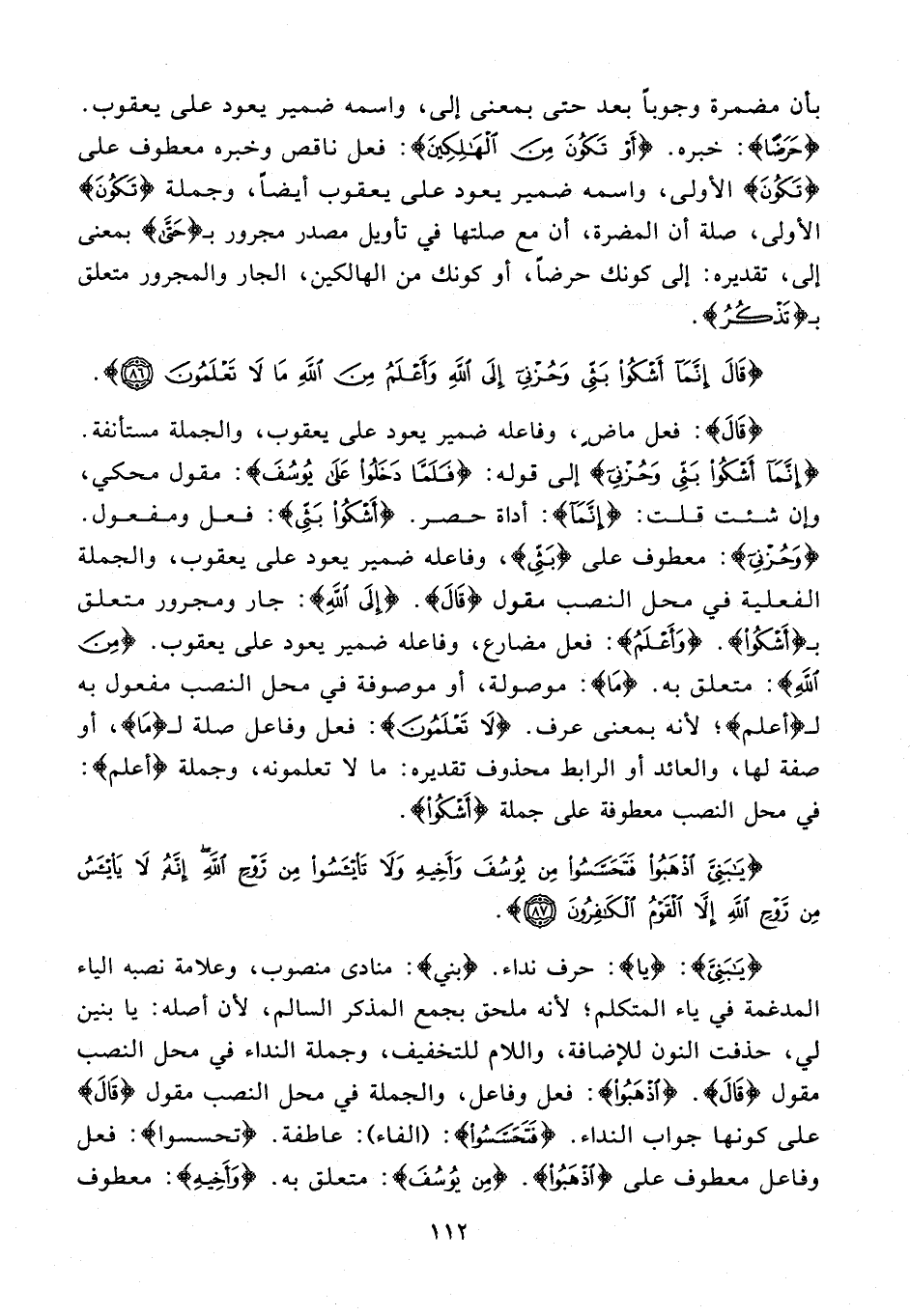 {قَالَ}: فعل ماض، وفاعله ضمير يعود على يعقوب، والجملة مستأنفة. {إِنَّمَا أَشْكُو بَثِّي وَحُزْنِي} إلى قوله: {فَلَمَّا دَخَلُوا عَلَى يُوسُفَ}: مقول محكي، وإن شئت قلت: {إِنَّمَا}: أداة حصر. {أَشْكُو بَثِّي}: فعل ومفعول. {وَحُزْنِي}: معطوف على {بَثِّي}، وفاعله ضمير يعود على يعقوب، والجملة الفعلية في محل النصب مقول {قَالَ}. {إِلَى اللَّهِ}: جار ومجرور متعلق بـ {أَشْكُو}. {وَأَعْلَمُ}: فعل مضارع، وفاعله ضمير يعود على يعقوب. {مِنَ اللَّهِ}: متعلق به. {مَا}: موصولة، أو موصوفة في محل النصب مفعول به لـ {أعلم}؛ لأنه بمعنى عرف. {لَا تَعْلَمُونَ}: فعل وفاعل صلة لـ {مَا}، أو صفة لها، والعائد أو الرابط محذوف تقديره: ما لا تعلمونه، وجملة {أعلم}: في محل النصب معطوفة على جملة {أَشْكُو}.