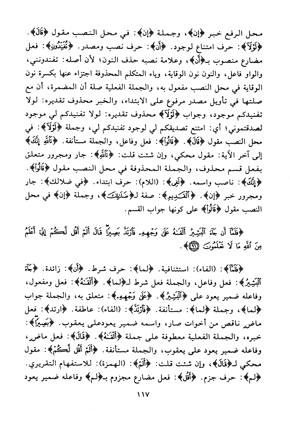 {فَلَمَّا}: (الفاء): استئنافية. {لما}: حرف شرط. {أَنْ}: زائدة. {جَاءَ الْبَشِيرُ}: فعل وفاعل، والجملة فعل شرط لـ {لما}. {أَلْقَاهُ}: فعل ومفعول، وفاعله ضمير يعود على {الْبَشِيرُ}. {عَلَى وَجْهِهِ}: متعلق به، والجملة جواب {لما}، وجملة {لما}: مستأنفة. {فَارْتَدَّ}: (الفاء): عاطفة. {ارتد}: فعل ماضٍ ناقص من أخوات صار، واسمه ضمير يعود على يعقوب. {بَصِيرًا}: خبره، والجملة الفعلية معطوفة على جملة {أَلْقَاهُ}. {قَالَ}: فعل ماضٍ، وفاعله ضمير يعود على يعقوب، والجملة مستأنفة. {أَلَمْ أَقُلْ لَكُمْ}: مقول محكي لـ {قَالَ}، وإن شئت قلت: {أَلَمْ}: (الهمزة): للاستفهام التقريري. {لم}: حرف جزم. {أَقُلْ}: فعل مضارع مجزوم بـ {لم} وفاعله ضمير يعود