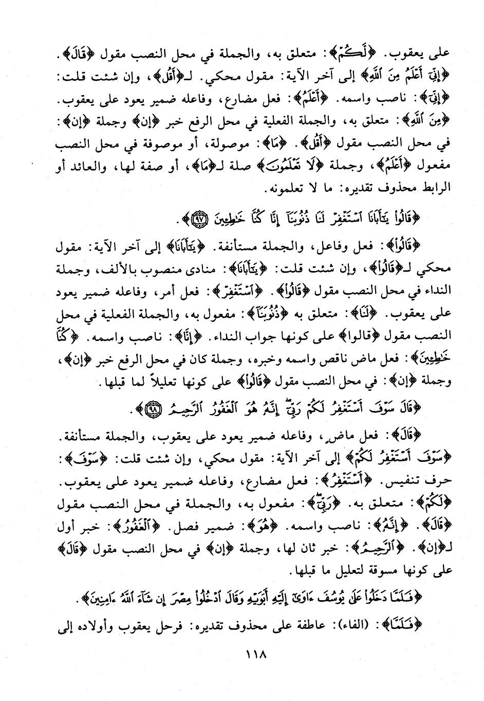 {قَالَ}: فعل ماضٍ، وفاعله ضمير يعود على يعقوب، والجملة مستأنفة. {سَوْفَ أَسْتَغْفِرُ لَكُمْ} إلى آخر الآية: مقول محكي، وإن شئت قلت: {سَوْفَ}: حرف تنفيس. {أَسْتَغْفِرُ}: فعل مضارع، وفاعله ضمير يعود على يعقوب. {لَكُمْ}: متعلق به. {رَبِّي}: مفعول به، والجملة في محل النصب مقول {قَالَ}. {إِنَّهُ}: ناصب واسمه. {هُوَ}: ضمير فصل. {الْغَفُورُ}: خبر أول لـ {إن}. {الرَّحِيمُ}: خبر ثان لها، وجملة {إن} في محل النصب مقول {قَالَ} على كونها مسوقة لتعليل ما قبلها.