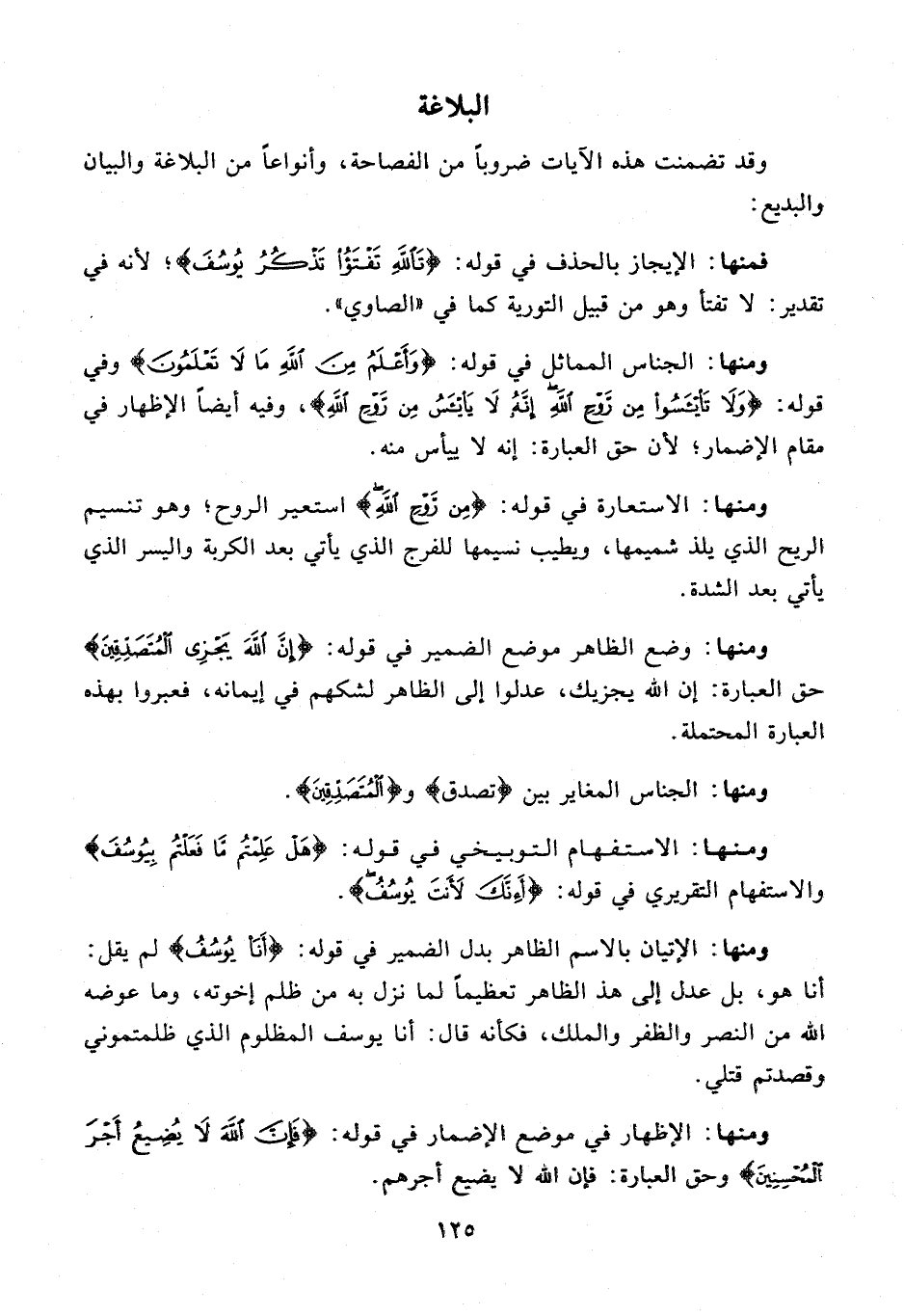 فمنها: الإيجاز بالحذف في قوله: {قَالُوا تَاللَّهِ تَفْتَأُ تَذْكُرُ يُوسُفَ}؛ لأنه في تقدير: لا تفتأ وهو من قبيل التورية كما في "الصاوي".