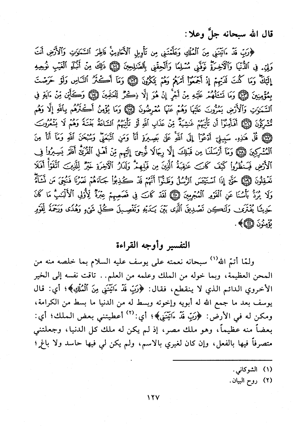 101 - ولمّا أتمّ الله (¬1) سبحانه نعمته على يوسف عليه السلام بما خلصه منه من المحن العظيمة، وبما خوله من الملك وعلمه من العلم .. تاقت نفسه إلى الخير الأخروي الدائم الذي لا ينقطع، فقال: {رَبِّ قَدْ آتَيْتَنِي مِنَ الْمُلْكِ}؛ أي: قال يوسف بعد ما جمع الله له أبويه وإخوته وبسط له من الدنيا ما بسط من الكرامة، ومكن له في الأرض: {رَبِّ قَدْ آتَيْتَنِي}؛ أي: (¬2) أعطيتني بعض الملك؛ أي: بعضًا منه عظيمًا، وهو ملك مصر، إذ لم يكن له ملك كل الدنيا، وجعلتني متصرفًا فيها بالفعل، وإن كان لغيري بالاسم، ولم يكن لي فيها حاسد ولا باغٍ؛