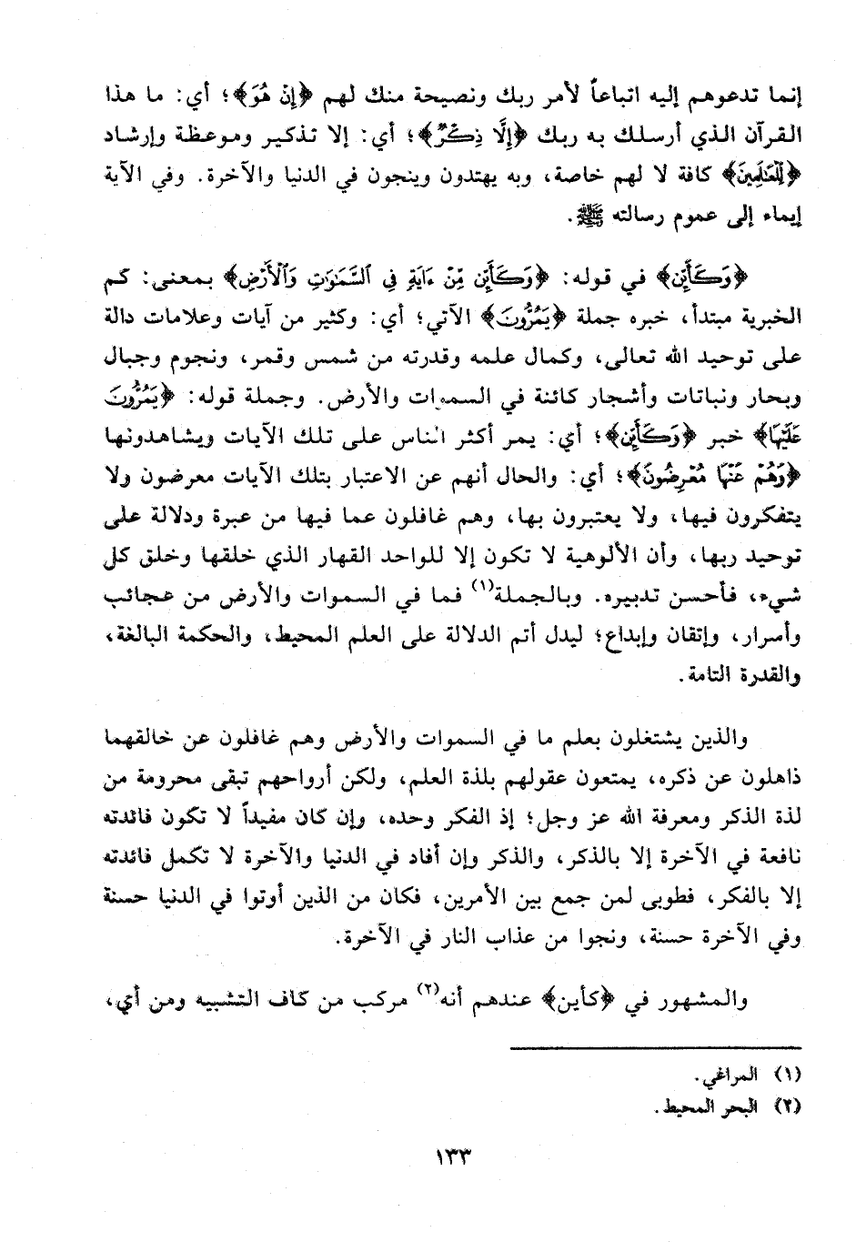 105 - {وَكَأَيِّنْ} في قوله: {وَكَأَيِّنْ مِنْ آيَةٍ فِي السَّمَاوَاتِ وَالْأَرْضِ} بمعنى: كم الخبرية مبتدأ، خبره جملة {يَمُرُّونَ} الآتي؛ أي: وكثير من آيات وعلامات دالة على توحيد الله تعالى، وكمال علمه وقدرته من شمس وقمر، ونجوم وجبال وبحار ونباتات وأشجار كائنة في السموات والأرض. وجملة قوله: {يَمُرُّونَ عَلَيْهَا} خبر {وَكَأَيِّنْ} أي: يمر أكثر الناس على تلك الآيات ويشاهدونها {وَهُمْ عَنْهَا مُعْرِضُونَ}؛ أي: والحال أنهم عن الاعتبار بتلك الآيات معرضون ولا يتفكرون فيها، ولا يعتبرون بها، وهم غافلون عما فيها من عبرة ودلالة على توحيد ربها، وأن الألوهية لا تكون إلا للواحد القهار الذي خلقها وخلق كل شيء، فأحسن تدبيره. وبالجملة (¬1) فما في السموات والأرض من عجائب وأسرار، وإتقان وإبداع؛ ليدل أتم الدلالة على العلم المحيط، والحكمة البالغة، والقدرة التامة.