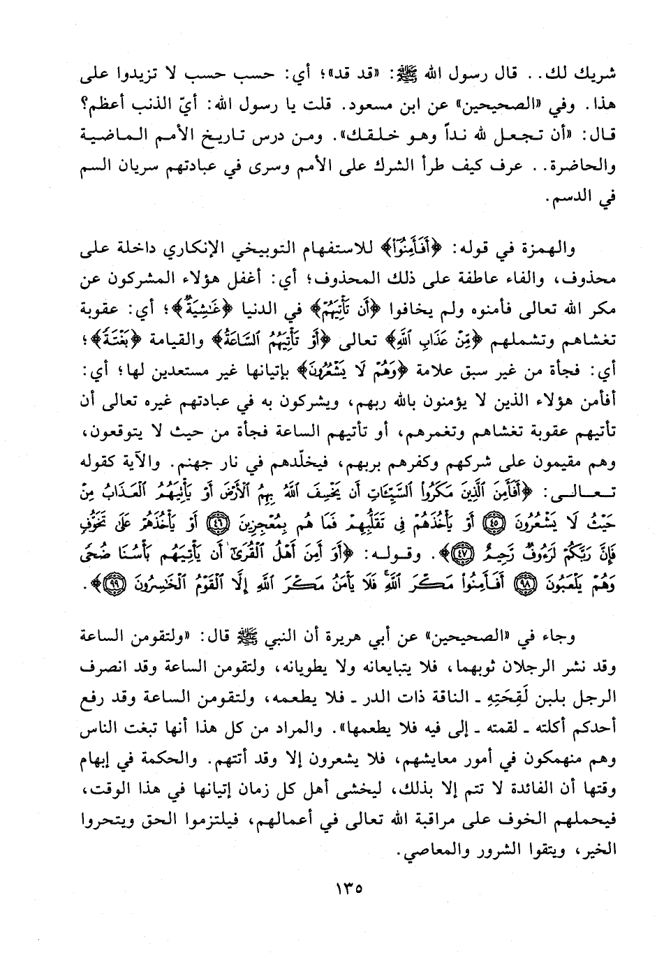 107 - والهمزة في قوله: {أَفَأَمِنُوا} للاستفهام التوبيخي الإنكاري داخلة على محذوف، والفاء عاطفة على ذلك المحذوف؛ أي: أغفل هؤلاء المشركون عن مكر الله تعالى فأمنوه ولم يخافوا {أَنْ تَأْتِيَهُمْ} في الدنيا {غَاشِيَةٌ}؛ أي: عقوبة تغشاهم وتشملهم {مِنْ عَذَابِ اللَّهِ} تعالى {أَوْ تَأْتِيَهُمُ السَّاعَةُ} والقيامة {بَغْتَةً}؛ أي: فجأة من غير سبق علامة {وَهُمْ لَا يَشْعُرُونَ} بإتيانها غير مستعدين لها؛ أي: أفأمن هؤلاء الذين لا يؤمنون بالله ربهم، ويشركون به في عبادتهم غيره تعالى أن تأتيهم عقوبة تغشاهم وتغمرهم، أو تأتيهم الساعة فجأة من حيث لا يتوقعون، وهم مقيمون على شركهم وكفرهم بربهم، فيخلّدهم في نار جهنم. والآية كقوله تعالى: {أَفَأَمِنَ الَّذِينَ مَكَرُوا السَّيِّئَاتِ أَنْ يَخْسِفَ اللَّهُ بِهِمُ الْأَرْضَ أَوْ يَأْتِيَهُمُ الْعَذَابُ مِنْ حَيْثُ لَا يَشْعُرُونَ (45) أَوْ يَأْخُذَهُمْ فِي تَقَلُّبِهِمْ فَمَا هُمْ بِمُعْجِزِينَ (46) أَوْ يَأْخُذَهُمْ عَلَى تَخَوُّفٍ فَإِنَّ رَبَّكُمْ لَرَءُوفٌ رَحِيمٌ (47)}. وقوله: {أَوَأَمِنَ أَهْلُ الْقُرَى أَنْ يَأْتِيَهُمْ بَأْسُنَا ضُحًى وَهُمْ يَلْعَبُونَ (98) أَفَأَمِنُوا مَكْرَ اللَّهِ فَلَا يَأْمَنُ مَكْرَ اللَّهِ إِلَّا الْقَوْمُ الْخَاسِرُونَ (99)}.