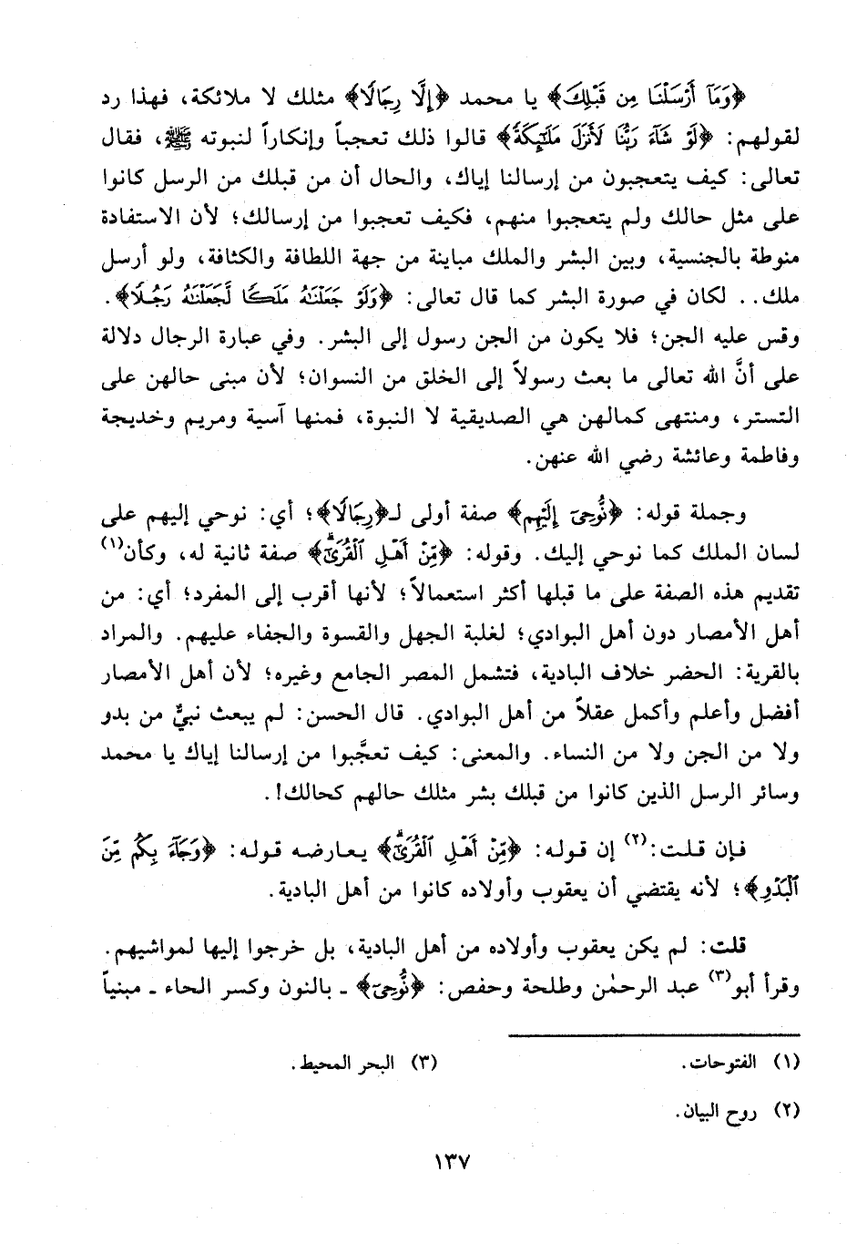 وجملة قوله: {نُوحِي إِلَيْهِمْ} صفة أولى لـ {رَجُلًا}؛ أي: نوحي إليهم على لسان الملك كما نوحي إليك. وقوله: {مِنْ أَهْلِ الْقُرَى} صفة ثانية له، وكأن (¬1) تقديم هذه الصفة على ما قبلها أكثر استعمالًا؛ لأنها أقرب إلى المفرد؛ أي: من أهل الأمصار دون أهل البوادي؛ لغلبة الجهل والقسوة والجفاء عليهم. والمراد بالقرية: الحضر خلاف البادية، فتشمل المصر الجامع وغيره؛ لأن أهل الأمصار أفضل وأعلم وأكمل عقلًا من أهل البوادي. قال الحسن: لم يبعث نبيٌّ من بدو ولا من الجن ولا من النساء. والمعنى: كيف تعجَّبوا من إرسالنا إياك يا محمد وسائر الرسل الذين كانوا من قبلك بشر مثلك حالهم كحالك!.