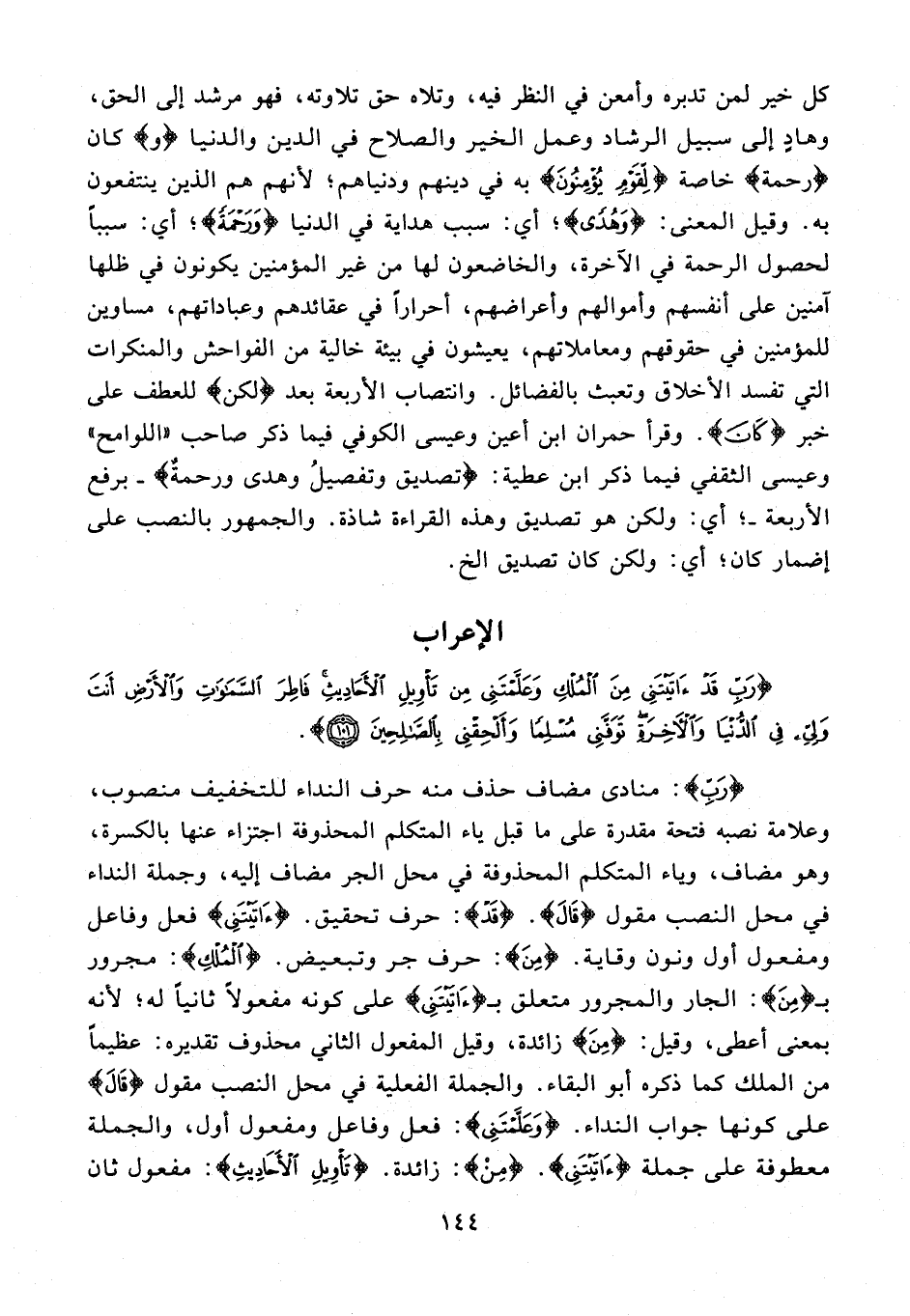 {رَبِّ}: منادى مضاف حذف منه حرف النداء للتخفيف منصوب، وعلامة نصبه فتحة مقدرة على ما قبل ياء المتكلم المحذوفة اجتزاء عنها بالكسرة، وهو مضاف، وياء المتكلم المحذوفة في محل الجر مضاف إليه، وجملة النداء في محل النصب مقول {قاَلَ}. {قَدْ} حرف تحقيق. {آتَيْتَنِي} فعل وفاعل ومفعول أول ونون وقاية. {مِنَ}: حرف جر وتبعيض. {الْمُلْكِ}: مجرور بـ {مِنَ}: الجار والمجرور متعلق بـ {آتَيْتَنِي} على كونه مفعولًا ثانيًا له؛ لأنه بمعنى أعطى، وقيل: {مِنَ} زائدة، وقيل المفعول الثاني محذوف تقديره: عظيمًا من الملك كما ذكره أبو البقاء. والجملة الفعلية في محل النصب مقول {قَالَ} على كونها جواب النداء. {وَعَلَّمْتَنِي}: فعل وفاعل ومفعول أول، والجملة معطوفة على جملة {آتَيْتَنِي}. {مِنْ}: زائدة. {تَأْوِيلِ الْأَحَادِيثِ}: مفعول ثان