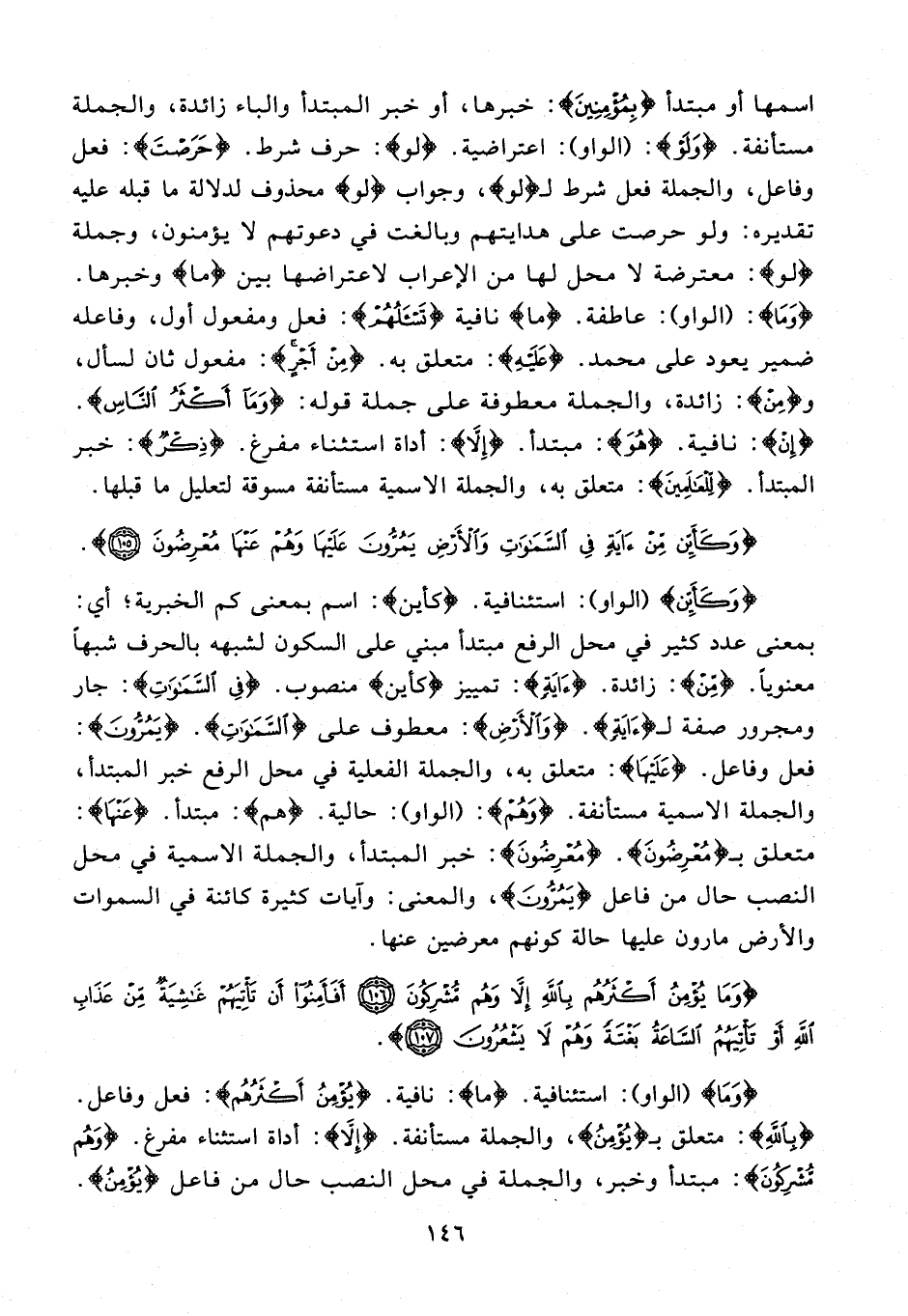 {وَمَا} (الواو): استئنافية. {ما}: نافية. {يُؤْمِنُ أَكْثَرُهُمْ}: فعل وفاعل. {بِاللَّهِ}: متعلق بـ {يُؤْمِنُ}، والجملة مستأنفة. {إِلَّا}: أداة استثناء مفرغ. {وَهُمْ مُشْرِكُونَ}: مبتدأ وخبر، والجملة في محل النصب حال من فاعل {يُؤْمِنُ}.