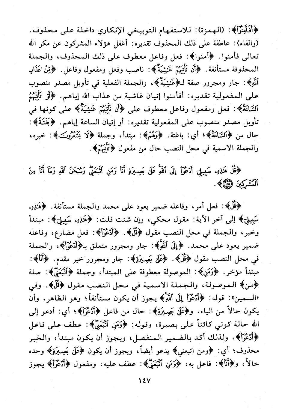 {قُلْ}: فعل أمر، وفاعله ضمير يعود على محمد والجملة مستأنفة. {هَذِهِ سَبِيلِي} إلى آخر الآية: مقول محكي، وإن شئت قلت: {هَذِهِ سَبِيلِي}: مبتدأ وخبر، والجملة في محل النصب مقول {قُلْ}. {أَدْعُو}: فعل مضارع، وفاعله ضمير يعود على محمد. {إِلَى اللَّهِ}: جار ومجرور متعلق بـ {أَدْعُوا}، والجملة في محل النصب مقول {قُلْ}. {عَلَى بَصِيرَةٍ}: جار ومجرور خبر مقدم. {أَنَا}: مبتدأ مؤخر. {وَمَنِ}: الموصولة معطوفة على المبتدأ، وجملة {اَتَّبَعَنِي}: صلة {من} الموصولة، والجملة الاسمية في محل النصب مقول {قُلْ}. وفي "السمين": قوله: {أَدْعُو إِلَى اللَّهِ} يجوز أن يكون مستأنفًا؛ وهو الظاهر، وأن يكون حالًا من الياء، و {عَلَى بَصِيرَةٍ}: حال من فاعل {أَدْعُوا}؛ أي: أدعو إلى الله حالة كوني كائنًا على بصيرة، وقوله: {وَمَنِ اَتبَعَنِي}: عطف على فاعل {أَدْعُوا}، ولذلك أكد بالضمير المنفصل، ويجوز أن يكون مبتدأ، والخبر محذوف؛ أي: {وَمَنِ اَتبَعَنِي} يدعو أيضًا، ويجوز أن يكون {عَلَى بَصِيرَةٍ} وحده حالًا، و {أَنَا}: فاعل به، {وَمَنِ اَتَّبَعَنِي}: عطف عليه، ومفعول {أَدْعُوا} يجوز