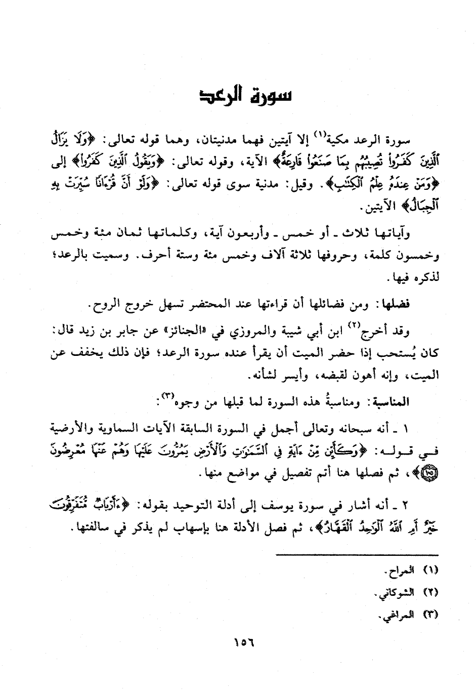 وآياتها ثلاث - أو خمس - وأربعون آية، وكلماتها ثمان مئة وخمس وخمسون كلمة، وحروفها ثلاثة آلاف وخمس مئة وستة أحرف. وسميت بالرعد؛ لذكره فيها.