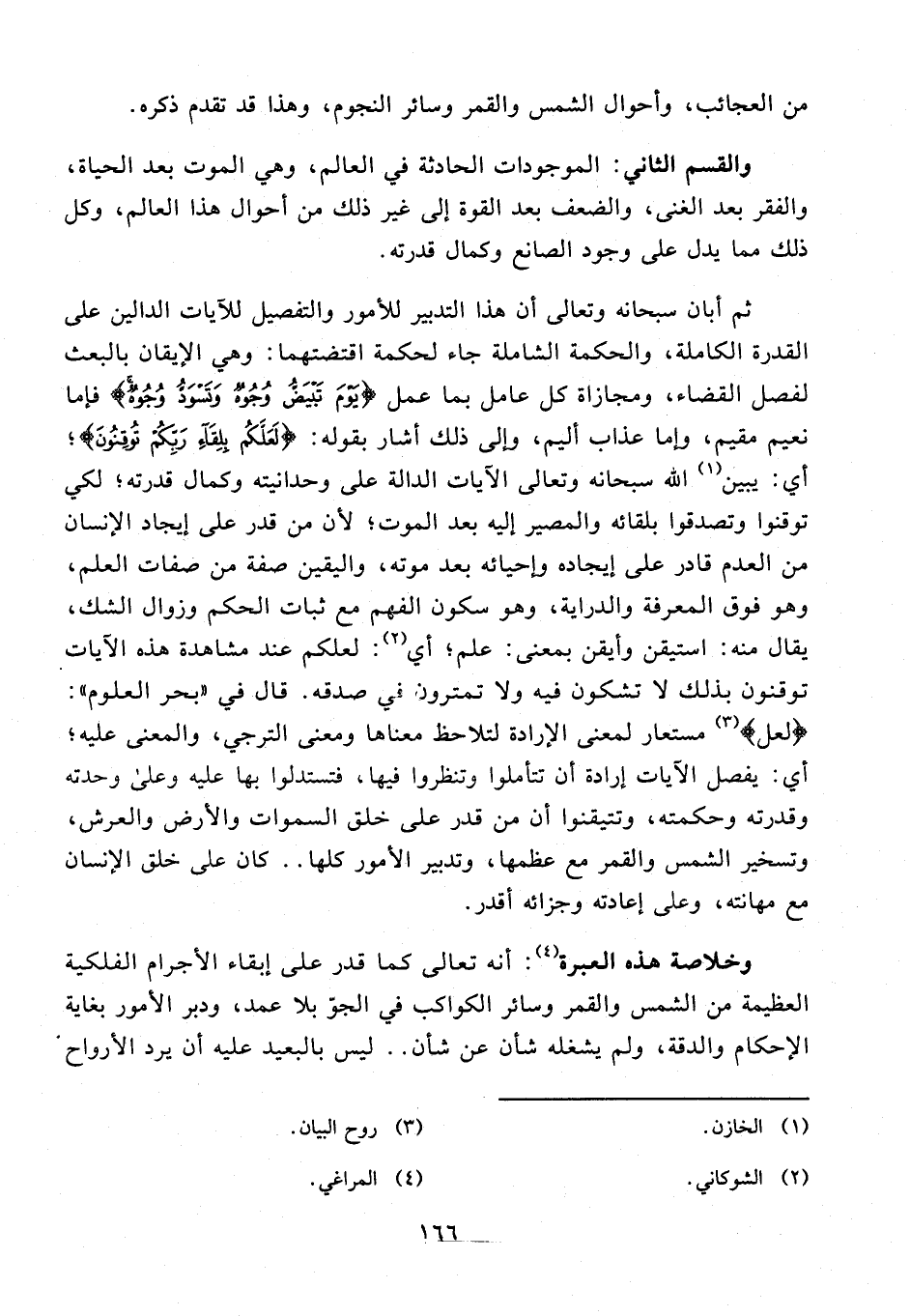 وخلاصة هذه العبرة (¬4): أنه تعالى كما قدر على إبقاء الأجرام الفلكية العظيمة من الشمس والقمر وسائر الكواكب في الجوّ بلا عمد، ودبر الأمور بغاية الإحكام والدقة، ولم يشغله شأن عن شأن .. ليس بالبعيد عليه أن يرد الأرواح