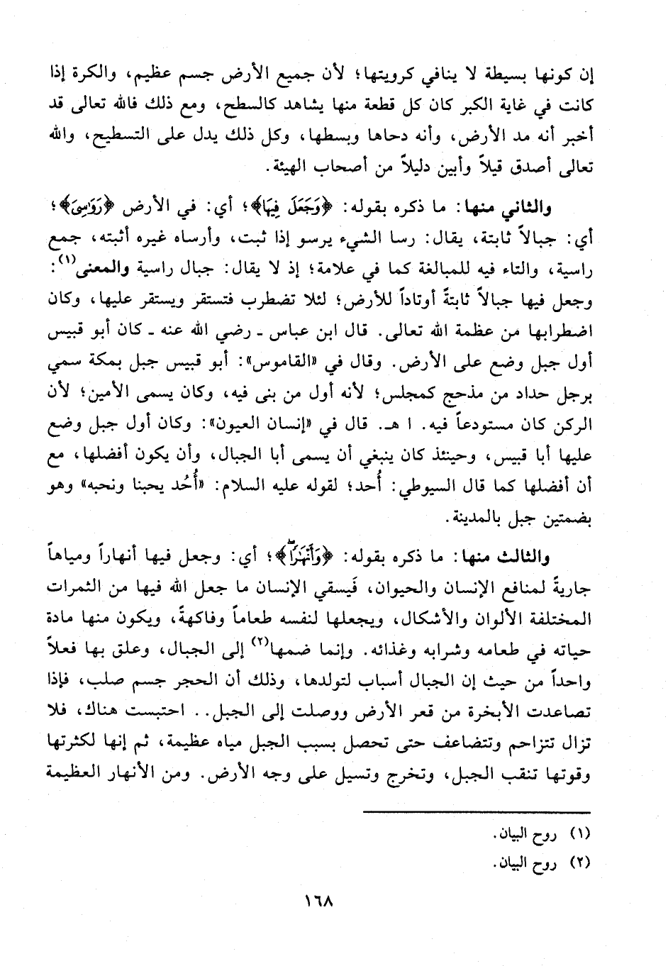 والثاني منها: ما ذكره بقوله: {وَجَعَلَ فِيهَا}؛ أي: في الأرض {رَوَاسِيَ}؛ أي: جبالًا ثابتة، يقال: رسا الشيء يرسو إذا ثبت، وأرساه غيره أثبته، جمع راسية، والتاء فيه للمبالغة كما في علامة؛ إذ لا يقال: جبال راسية والمعنى (¬1): وجعل فيها جبالًا ثابتةً أوتادًا للأرض؛ لئلا تضطرب فتستقر ويستقر عليها، وكان اضطرابها من عظمة الله تعالى. قال ابن عباس - رضي الله عنه - كان أبو قبيس أول جبل وضع على الأرض. وقال في "القاموس": أبو قبيس جبل بمكة سمي برجل حداد من مذحج كمجلس؛ لأنه أول من بنى فيه، وكان يسمى الأمين؛ لأن الركن كان مستودعًا فيه. اهـ. قال في "إنسان العيون": وكان أول جبل وضع عليها أبا قبيس، وحينئذ كان ينبغي أن يسمى أبا الجبال، وأن يكون أفضلها، مع أن أفضلها كما قال السيوطي: أُحد؛ لقوله عليه السلام: "أُحُد يحبنا ونحبه" وهو بضمتين جبل بالمدينة.