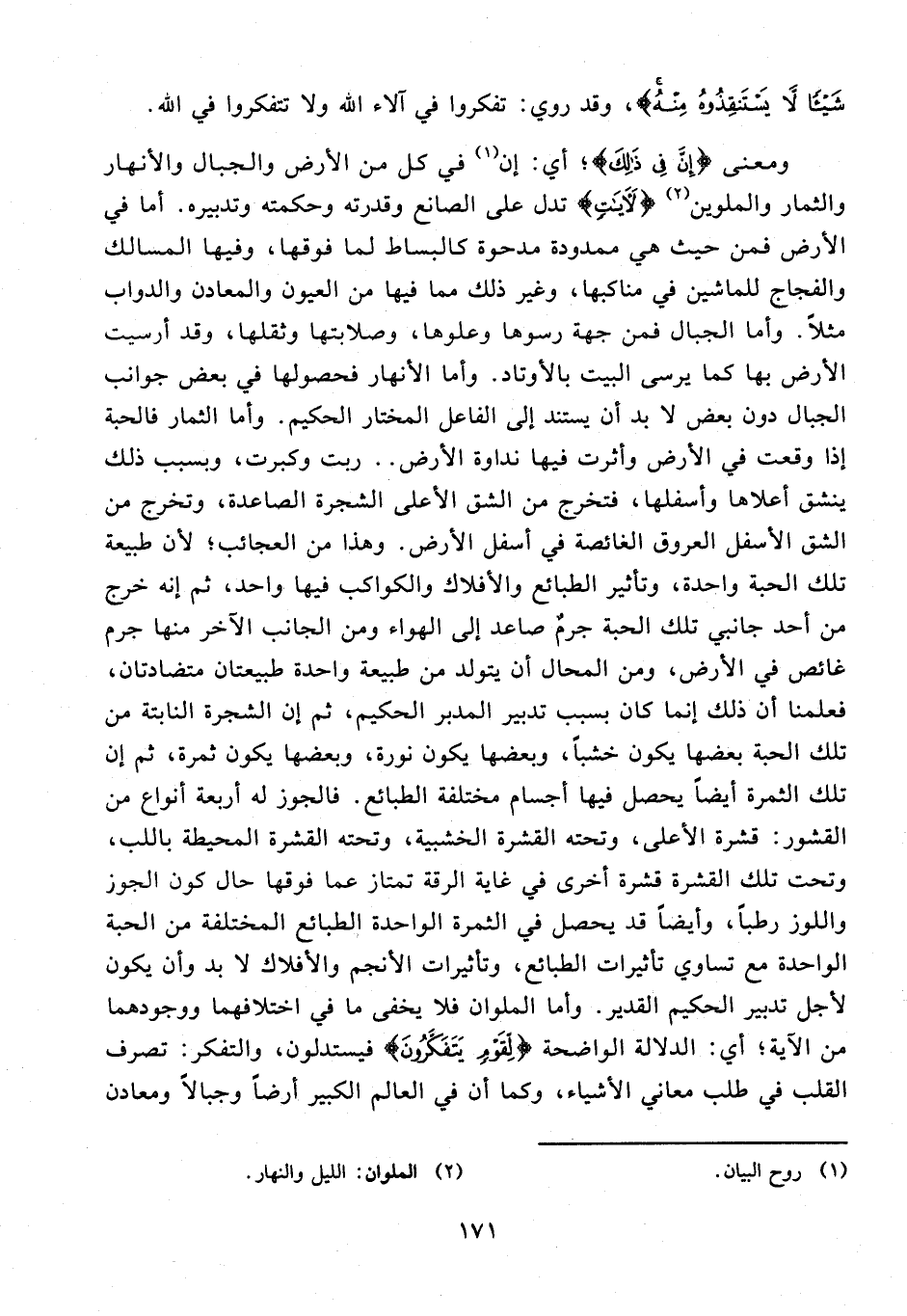 ومعنى {إِنَّ فِي ذَلِكَ}؛ أي: إن (¬1) في كل من الأرض والجبال والأنهار والثمار والملوين (¬2) {لَآيَاتٍ} تدل على الصانع وقدرته وحكمته وتدبيره. أما في الأرض فمن حيث هي ممدودة مدحوة كالبساط لما فوقها، وفيها المسالك والفجاج للماشين في مناكبها، وغير ذلك مما فيها من العيون والمعادن والدواب مثلًا. وأما الجبال فمن جهة رسوها وعلوها، وصلابتها وثقلها، وقد أرسيت الأرض بها كما يرسى البيت بالأوتاد. وأما الأنهار فحصولها في بعض جوانب الجبال دون بعض لا بد أن يستند إلى الفاعل المختار الحكيم. وأما الثمار فالحبة إذا وقعت في الأرض وأثرت فيها نداوة الأرض .. ربت وكبرت، وبسبب ذلك ينشق أعلاها وأسفلها، فتخرج من الشق الأعلى الشجرة الصاعدة، وتخرج من الشق الأسفل العروق الغائصة في أسفل الأرض. وهذا من العجائب؛ لأن طبيعة تلك الحبة واحدة، وتأثير الطبائع والأفلاك والكواكب فيها واحد، ثم إنه خرج من أحد جانبي تلك الحبة جرمٌ صاعد إلى الهواء ومن الجانب الآخر منها جرم غائص في الأرض، ومن المحال أن يتولد من طبيعة واحدة طبيعتان متضادتان، فعلمنا أن ذلك إنما كان بسبب تدبير المدبر الحكيم، ثم إن الشجرة النابتة من تلك الحبة بعضها يكون خشبًا، وبعضها يكون نورة، وبعضها يكون ثمرة، ثم إن تلك الثمرة أيضًا يحصل فيها أجسام مختلفة الطبائع. فالجوز له أربعة أنواع من القشور: قشرة الأعلى، وتحته القشرة الخشبية، وتحته القشرة المحيطة باللب، وتحت تلك القشرة قشرة أخرى في غاية الرقة تمتاز عما فوقها حال كون الجوز واللوز رطبًا، وأيضًا قد يحصل في الثمرة الواحدة الطبائع المختلفة من الحبة الواحدة مع تساوي تأثيرات الطبائع، وتأثيرات الأنجم والأفلاك لا بد وأن يكون لأجل تدبير الحكيم القدير. وأما الملوان فلا يخفى ما في اختلافهما ووجودهما من الآية؛ أي: الدلالة الواضحة {لِقَوْمٍ يَتَفَكَّرُونَ} فيستدلون، والتفكر: تصرف القلب في طلب معاني الأشياء، وكما أن في العالم الكبير أرضًا وجبالًا ومعادن