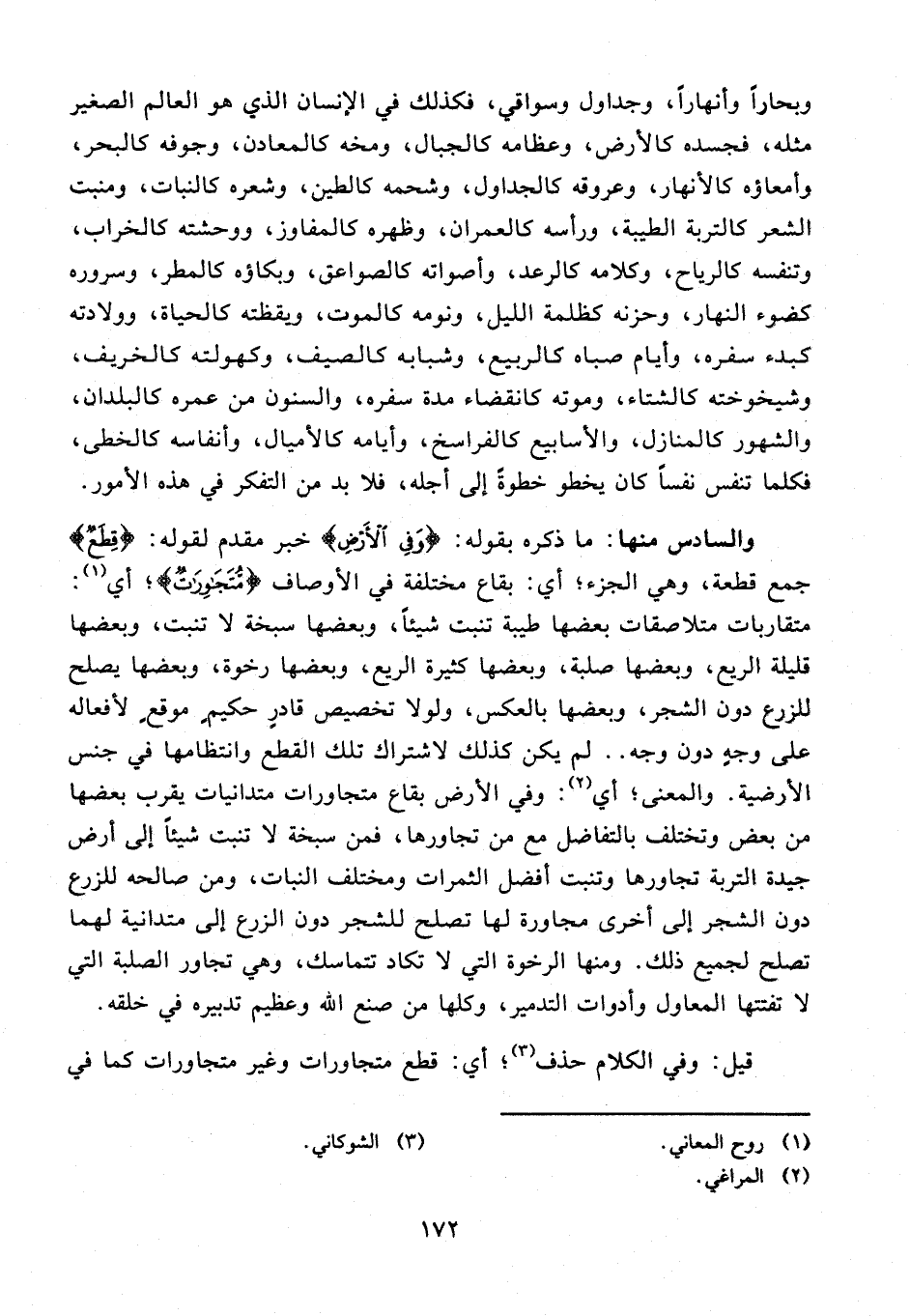 4 - والسادس منها: ما ذكره بقوله: {وَفِي الْأَرْضِ} خبر مقدم لقوله. {قِطَعٌ} جمع قطعة، وهي الجزء؛ أي: بقاع مختلفة في الأوصاف {مُتَجَاوِرَاتٌ}؛ أي (¬1): متقاربات متلاصقات بعضها طيبة تنبت شيئًا، وبعضها سبخة لا تنبت، وبعضها قليلة الريع، وبعضها صلبة، وبعضها كثيرة الريع، وبعضها رخوة، وبعضها يصلح للزرع دون الشجر، وبعضها بالعكس، ولولا تخصيص قادرٍ حكيمٍ موقعٍ لأفعاله على وجهٍ دون وجه .. لم يكن كذلك لاشتراك تلك القطع وانتظامها في جنس الأرضية. والمعنى؛ أي (¬2): وفي الأرض بقاع متجاورات متدانيات يقرب بعضها من بعض وتختلف بالتفاضل مع من تجاورها، فمن سبخة لا تنبت شيئًا إلى أرض جيدة التربة تجاورها وتنبت أفضل الثمرات ومختلف النبات، ومن صالحه للزرع دون الشجر إلى أخرى مجاورة لها تصلح للشجر دون الزرع إلى متدانية لهما تصلح لجميع ذلك. ومنها الرخوة التي لا تكاد تتماسك، وهي تجاور الصلبة التي لا تفتتها المعاول وأدوات التدمير، وكلها من صنع الله وعظيم تدبيره في خلقه.