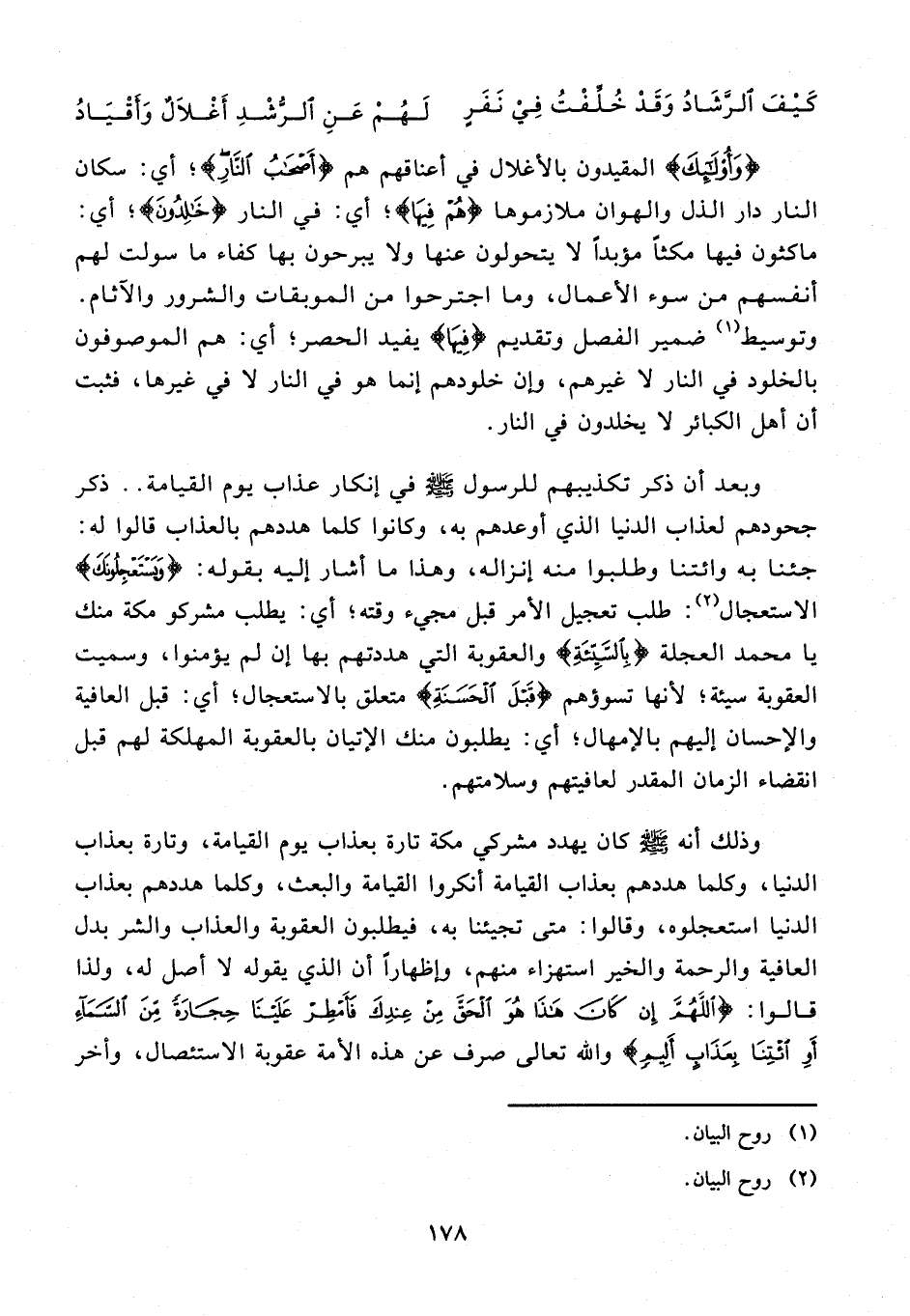 {وَأُولَئِكَ} المقيدون بالأغلال في أعناقهم هم {أَصْحَابُ النَّارِ}؛ أي: سكان النار دار الذل والهوان ملازموها {هُمْ فِيهَا}؛ أي: في النار {خَالِدُونَ}؛ أي: ماكثون فيها مكثًا مؤبدًا لا يتحولون عنها ولا يبرحون بها كفاء ما سولت لهم أنفسهم من سوء الأعمال، وما اجترحوا من الموبقات والشرور والآثام. وتوسيط (¬1) ضمير الفصل وتقديم {فِيهَا} يفيد الحصر؛ أي: هم الموصوفون بالخلود في النار لا غيرهم، وإن خلودهم إنما هو في النار لا في غيرها، فثبت أن أهل الكبائر لا يخلدون في النار.