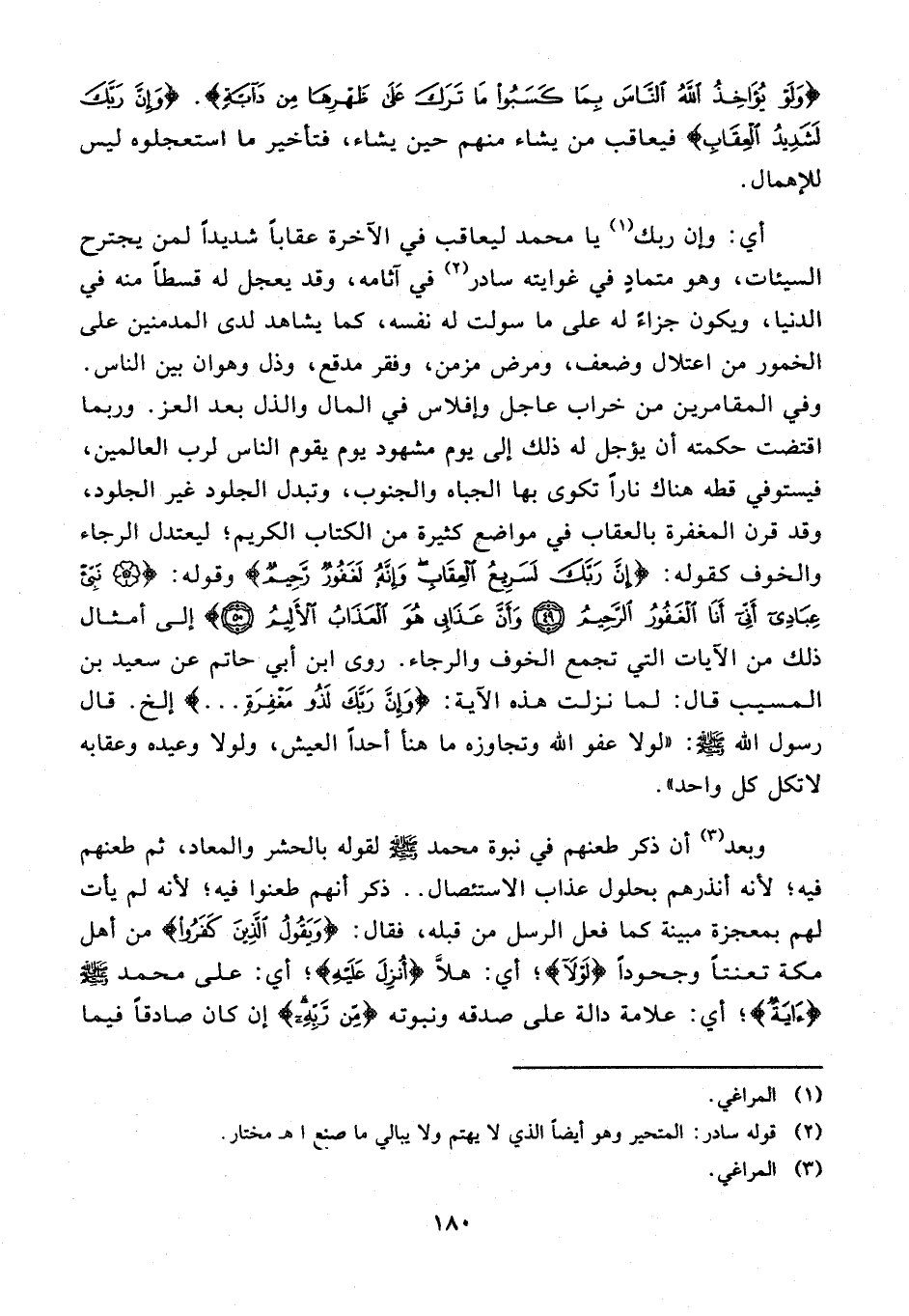 أي: وإن ربك (¬1) يا محمَّد ليعاقب في الآخرة عقابًا شديدًا لمن يجترح السيئات، وهو متمادٍ في غوايته سادر (¬2) في آثامه، وقد يعجل له قسطًا منه في الدنيا، ويكون جزاءً له على ما سولت له نفسه، كما يشاهد لدى المدمنين على الخمور من اعتلال وضعف، ومرض مزمن، وفقر مدقع، وذل وهوان بين الناس. وفي المقامرين من خراب عاجل وإفلاس في المال والذل بعد العز. وربما اقتضت حكمته أن يؤجل له ذلك إلى يوم مشهود يوم يقوم الناس لرب العالمين، فيستوفي قطه هناك نارًا تكوى بها الجباه والجنوب، وتبدل الجلود غير الجلود، وقد قرن المغفرة بالعقاب في مواضع كثيرة من الكتاب الكريم؛ ليعتدل الرَّجاء والخوف كقوله: {إِنَّ رَبَّكَ لَسَرِيعُ الْعِقَابِ وَإِنَّهُ لَغَفُورٌ رَحِيمٌ} وقوله: {نَبِّئْ عِبَادِي أَنِّي أَنَا الْغَفُورُ الرَّحِيمُ (49) وَأَنَّ عَذَابِي هُوَ الْعَذَابُ الْأَلِيمُ (50)} إلى أمثال ذلك من الآيات التي تجمع الخوف والرجاء. روى ابن أبي حاتم عن سعيد بن المسيب قال: لما نزلت هذه الآية: {وَإِنَّ رَبَّكَ لَذُو مَغْفِرَةٍ ...} إلخ. قال رسول الله - صلى الله عليه وسلم -: "لولا عفو الله وتجاوزه ما هنأ أحدًا العيش، ولولا وعيده وعقابه لاتكل كل واحد".