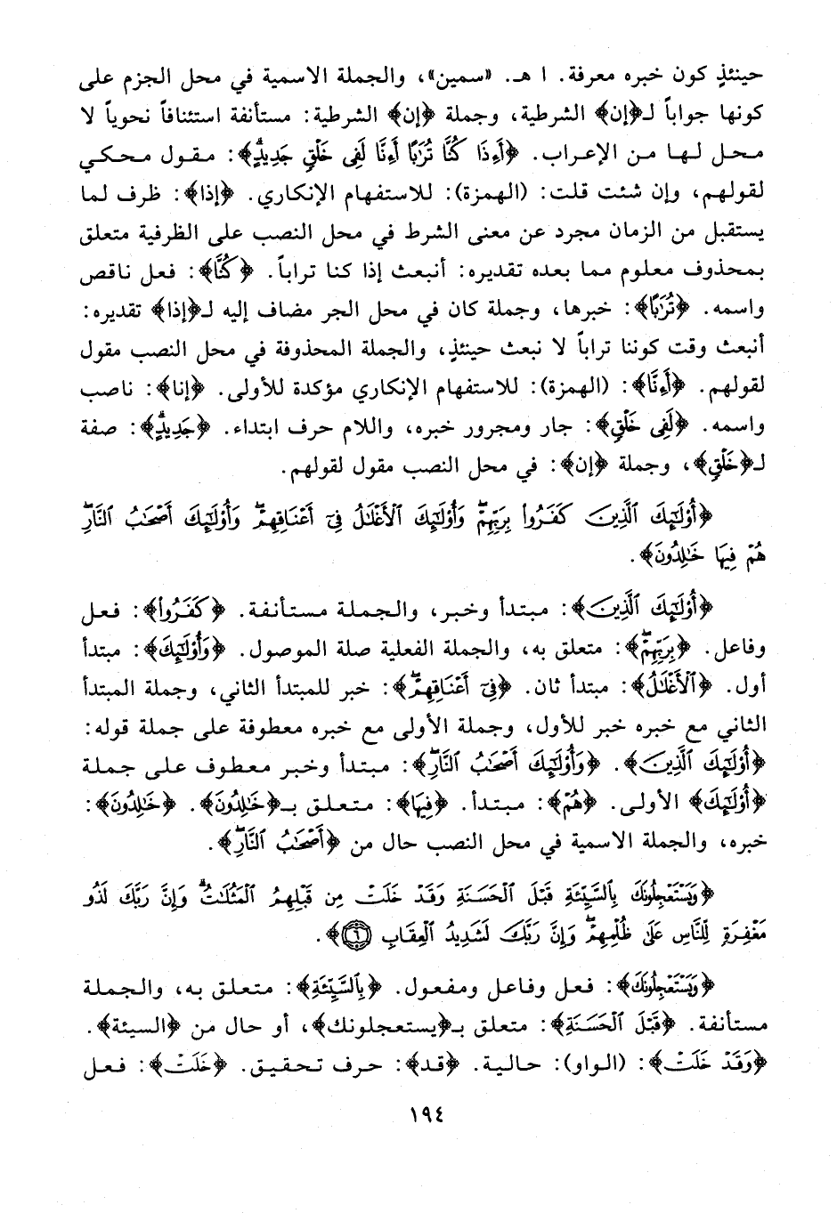 {أُولَئِكَ الَّذِينَ}: مبتدأ وخبر، والجملة مستأنفة. {كَفَرُوا}: فعل وفاعل. {بِرَبِّهِمْ}: متعلق به، والجملة الفعلية صلة الموصول. {وَأُولَئِكَ}: مبتدأ أول. {الْأَغْلَالُ}: مبتدأ ثان. {فِي أَعْنَاقِهِمْ}: خبر للمبتدأ الثاني، وجملة المبتدأ الثاني مع خبره خبر للأول، وجملة الأولى مع خبره معطوفة على جملة قوله: {أُولَئِكَ الَّذِينَ}. {وَأُولَئِكَ أَصْحَابُ النَّارِ}: مبتدأ وخبر معطوف على جملة {أُولَئِكَ} الأولى. {هُمْ}: مبتدأ. {فِيهَا}: متعلق بـ {خَالِدُونَ}. {خَالِدُونَ}: خبره، والجملة الاسمية في محل النصب حال من {أَصْحَابُ النَّارِ}.