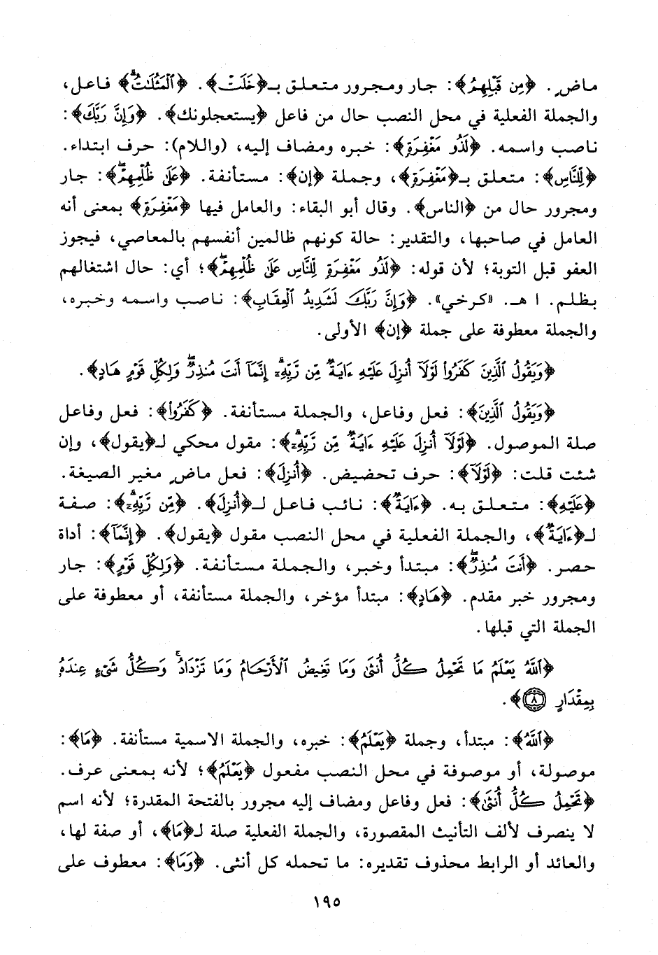 {وَيَقُولُ الَّذِينَ}: فعل وفاعل، والجملة مستأنفة. {كَفَرُوا}: فعل وفاعل صلة الموصول. {لَوْلَا أُنْزِلَ عَلَيْهِ آيَةٌ مِنْ رَبِّهِ}: مقول محكي لـ {يقول}، وإن شئت قلت: {لَوْلَا}: حرف تحضيض. {أُنْزِلَ}: فعل ماضٍ مغير الصيغة. {عَلَيْهِ}: متعلق به. {آيَةٌ}: نائب فاعل لـ {أُنْزِلَ}. {مِنْ رَبِّهِ}: صفة لـ {آيَةٌ}، والجملة الفعلية في محل النصب مقول {يقول}. {إِنَّمَا}: أداة حصر. {أَنْتَ مُنْذِرٌ}: مبتدأ وخبر، والجملة مستأنفة. {وَلِكُلِّ قَوْمٍ}: جار ومجرور خبر مقدم. {هَادٍ}: مبتدأ مؤخر، والجملة مستأنفة، أو معطوفة على الجملة التي قبلها.