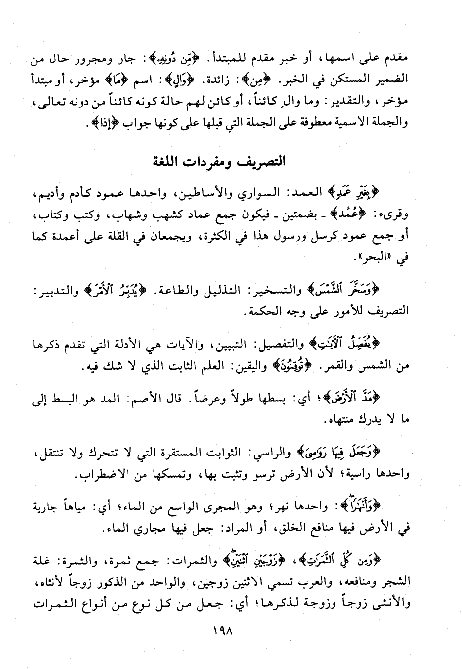 {بِغَيْرِ عَمَدٍ} العمد: السواري والأساطين، واحدها عمود كأدم وأديم، وقرىء: {عُمُد} - بضمتين - فيكون جمع عماد كشهب وشهاب، وكتب وكتاب، أو جمع عمود كرسل ورسول هذا في الكثرة، ويجمعان في القلة على أعمدة كما في "البحر".