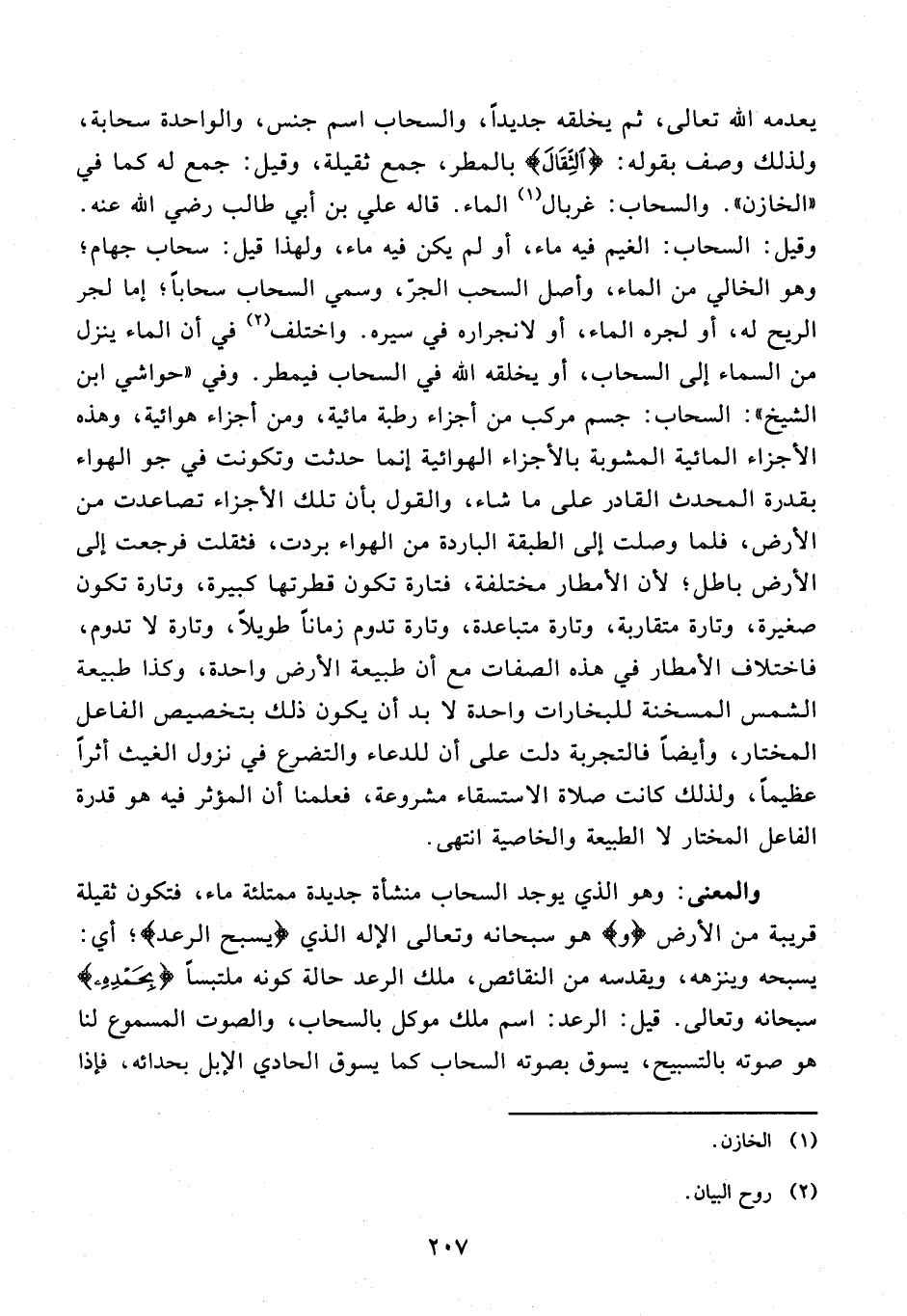 يعدمه الله تعالى، ثم يخلقه جديدًا، والسحاب اسم جنس، والواحدة سحابة، ولذلك وصف بقوله: {الثِّقَالَ} بالمطر، جمع ثقيلة، وقيل: جمع له كما في "الخازن". والسحاب: غربال (¬1) الماء. قاله علي بن أبي طالب رضي الله عنه. وقيل: السحاب: الغيم فيه ماء، أو لم يكن فيه ماء، ولهذا قيل: سحاب جهام؛ وهو الخالي من الماء، وأصل السحب الجرّ، وسمي السحاب سحابًا؛ إما لجر الريح له، أو لجره الماء، أو لانجراره في سيره. واختلف (¬2) في أن الماء ينزل من السماء إلى السحاب، أو يخلقه الله في السحاب فيمطر. وفي "حواشي ابن الشيخ": السحاب: جسم مركب من أجزاء رطبة مائية، ومن أجزاء هوائية، وهذه الأجزاء المائية المشوبة بالأجزاء الهوائية إنما حدثت وتكونت في جو الهواء بقدرة المحدث القادر على ما شاء، والقول بأن تلك الأجزاء تصاعدت من الأرض، فلما وصلت إلى الطبقة الباردة من الهواء بردت، فثقلت فرجعت إلى الأرض باطل؛ لأن الأمطار مختلفة، فتارة تكون قطرتها كبيرة، وتارة تكون صغيرة، وتارة متقاربة، وتارة متباعدة، وتارة تدوم زمانًا طويلًا، وتارة لا تدوم، فاختلاف الأمطار في هذه الصفات مع أن طبيعة الأرض واحدة، وهذا طبيعة الشمس المسخنة للبخارات واحدة لا بد أن يكون ذلك بتخصيص الفاعل المختار، وأيضًا فالتجربة دلت على أن للدعاء والتضرع في نزول الغيث أثرًا عظيمًا، ولذلك كانت صلاة الاستسقاء مشروعة، فعلمنا أن المؤثر فيه هو قدرة الفاعل المختار لا الطبيعة والخاصية انتهى.