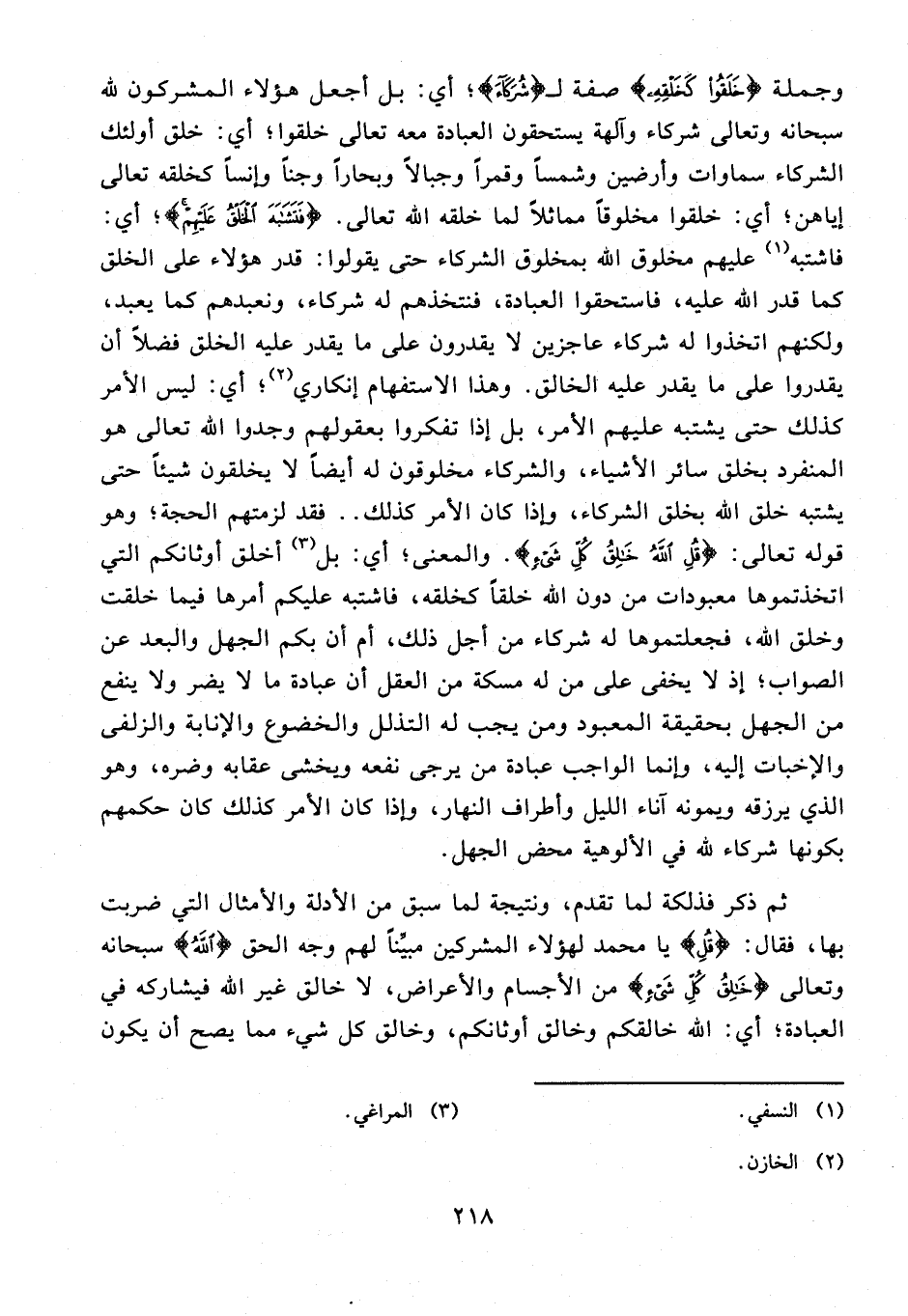 وجملة {خَلَقُوا كَخَلْقِهِ} صفة لـ {شُرَكَاءَ}؛ أي: بل أجعل هؤلاء المشركون لله سبحانه وتعالى شركاء وآلهة يستحقون العبادة معه تعالى خلقوا؛ أي: خلق أولئك الشركاء سماوات وأرضين وشمسًا وقمرًا وجبالًا وبحارًا وجنًّا وإنسًا كخلقه تعالى إياهن؛ أي: خلقوا مخلوقًا مماثلًا لما خلقه الله تعالى. {فَتَشَابَهَ الْخَلْقُ عَلَيْهِمْ}؛ أي: فاشتبه (¬1) عليهم مخلوق الله بمخلوق الشركاء حتى يقولوا: قدر هؤلاء على الخلق كما قدر الله عليه، فاستحقوا العبادة، فنتخذهم له شركاء، ونعبدهم كما يعبد، ولكنهم اتخذوا له شركاء عاجزين لا يقدرون على ما يقدر عليه الخلق فضلًا أن يقدروا على ما يقدر عليه الخالق. وهذا الاستفهام إنكاري (¬2)؛ أي: ليس الأمر كذلك حتى يشتبه عليهم الأمر، بل إذا تفكروا بعقولهم وجدوا الله تعالى هو المنفرد بخلق سائر الأشياء، والشركاء مخلوقون له أيضًا لا يخلقون شيئًا حتى يشتبه خلق الله بخلق الشركاء، وإذا كان الأمر كذلك .. فقد لزمتهم الحجة؛ وهو قوله تعالى: {قُلِ اللَّهُ خَالِقُ كُلِّ شَيْءٍ}. والمعنى؛ أي: بل (¬3) أخلق أوثانكم التي اتخذتموها معبودات من دون الله خلقًا كخلقه، فاشتبه عليكم أمرها فيما خلقت وخلق الله، فجعلتموها له شركاء من أجل ذلك، أم أن بكم الجهل والبعد عن الصواب؛ إذ لا يخفى على من له مسكة من العقل أن عبادة ما لا يضر ولا ينفع من الجهل بحقيقة المعبود ومن يجب له التذلل والخضوع والإنابة والزلفى والإخبات إليه، وإنما الواجب عبادة من يرجى نفعه ويخشى عقابه وضره، وهو الذي يرزقه ويمونه آناء الليل وأطراف النهار، وإذا كان الأمر كذلك كان حكمهم بكونها شركاء لله في الألوهية محض الجهل.