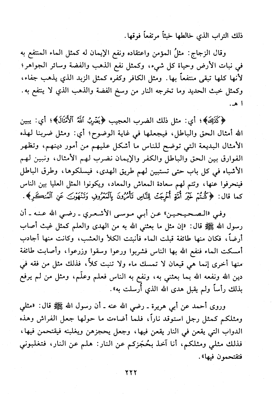 وقال الزجاج: مثلُ المؤمن واعتقاده ونفع الإيمان له كمثل الماء المنتفع به في نبات الأرض وحياة كل شيء، وكمثل نفع الذهب والفضة وسائر الجواهر؛ لأنها كلها تبقى منتفعًا بها. ومثل الكافر وكفره كمثل الزبد الذي يذهب جفاء، وكمثل خبث الحديد وما تخرجه النار من وسخ الفضة والذهب الذي لا ينتفع به. اهـ.