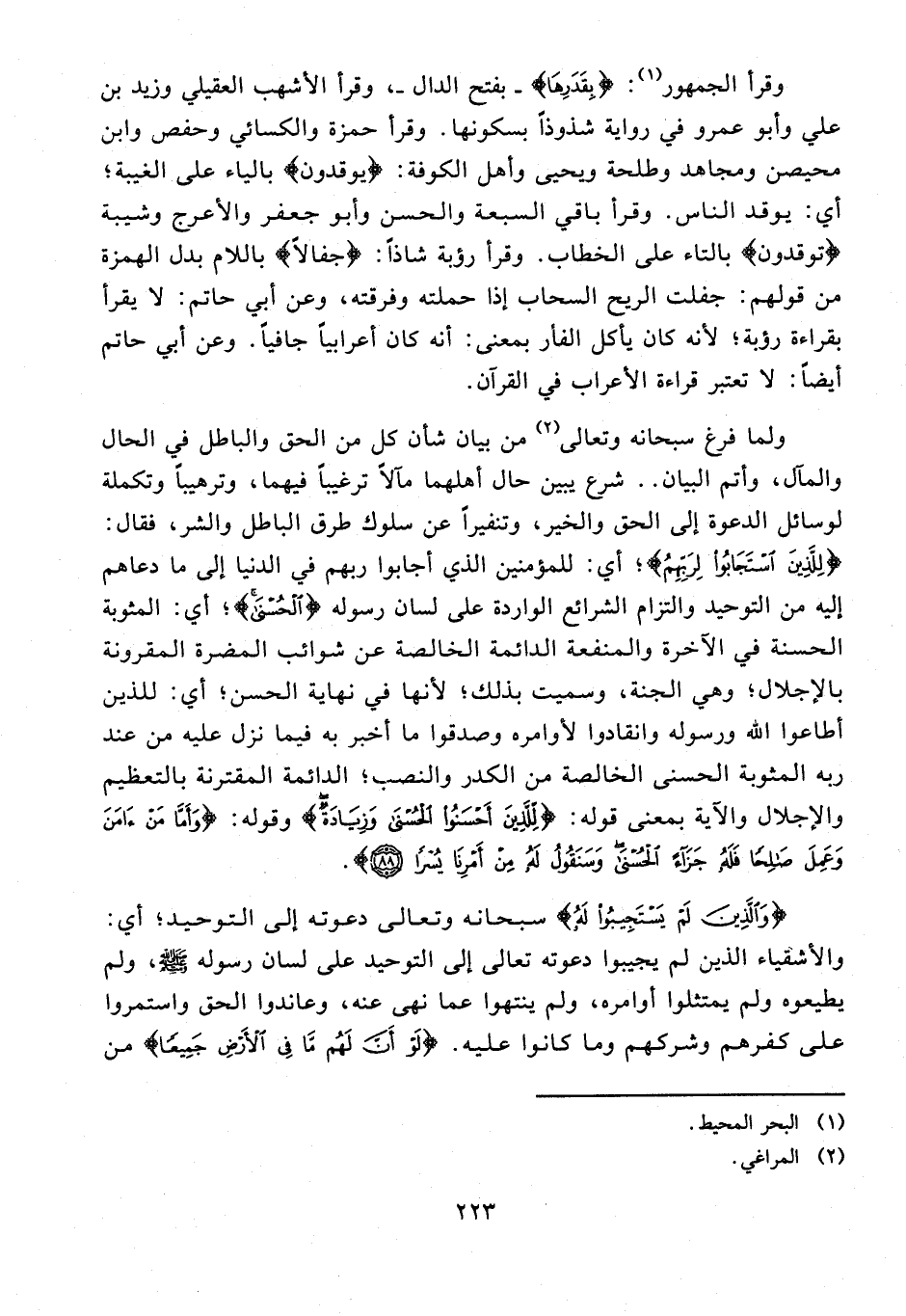 وقرأ الجمهور (¬1): {بِقَدَرِهَا} - بفتح الدال -، وقرأ الأشهب العقيلي وزيد بن علي وأبو عمرو في رواية شذوذًا بسكونها. وقرأ حمزة والكسائي وحفص وابن محيصن ومجاهد وطلحة ويحيى وأهل الكوفة: {يوقدون} بالياء على الغيبة؛ أي: يوقد الناس. وقرأ باقي السبعة والحسن وأبو جعفر والأعرج وشيبة {توقدون} بالتاء على الخطاب. وقرأ رؤبة شاذًا: {جفالًا} باللام بدل الهمزة من قولهم: جفلت الريح السحاب إذا حملته وفرقته، وعن أبي حاتم: لا يقرأ بقراءة رؤبة؛ لأنه كان يأكل الفأر بمعنى: أنه كان أعرابيًّا جافيًا. وعن أبي حاتم أيضًا: لا تعتبر قراءة الأعراب في القرآن.