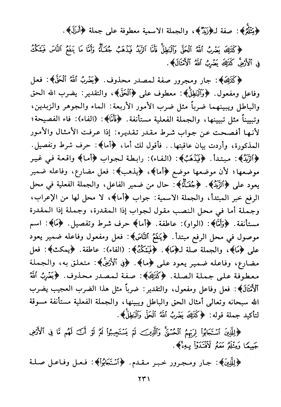 {كَذَلِكَ}: جار ومجرور صفة لمصدر محذوف. {يَضْرِبُ اللَّهُ الْحَقَّ}: فعل وفاعل ومفعول. {وَالْبَاطِلَ}: معطوف على {الْحَقَّ}، والتقدير: يضرب الله الحق والباطل ويبينهما ضربًا مثل ضرب الأمور الأربعة: الماء والجوهر والزبدين، وتبيينًا مثل تبيينها، والجملة الفعلية مستأنفة. {فَأَمَّا}: (الفاء): فاء الفصيحة؛ لأنها أفصحت عن جواب شرط مقدر تقديره: إذا عرفت الأمثال والأمور المذكورة، وأردت بيان عاقبتها .. فأقول لك أما، {أما}: حرف شرط وتفصيل. {الزَّبَدُ}: مبتدأ. {فَيَذْهَبُ}: (الفاء): رابطة لجواب {أما} واقعة في غير موضعها؛ لأن موضعها موضع {أما}، {يذهب}: فعل مضارع، وفاعله ضمير يعود على {الزَّبَدُ}. {جُفَاءً}: حال من ضمير الفاعل، والجملة الفعلية في محل الرفع خبر المبتدأ، والجملة الاسمية: جواب {أما}، لا محل لها من الإعراب، وجملة أما في محل النصب مقول لجواب إذا المقدرة، وجملة إذا المقدرة مستأنفة. {وأمَّا}: (الواو): عاطفة. {أما} حرف شرط وتفصيل. {مَا}: اسم موصول في محل الرفع مبتدأ. {يَنْفَعُ النَّاسَ}: فعل ومفعول وفاعله ضمير يعود على {مَا}، والجملة صلة لـ {مَا}. {فَيَمْكُثُ}: (الفاء): عاطفة. {يمكث}: فعل مضارع، وفاعله ضمير يعود على {ما}. {فِي الْأَرْضِ}: متعلق به، والجملة معطوفة على جملة الصلة. {كَذَلِكَ}: صفة لمصدر محذوف. {يَضْرِبُ اللَّهُ الْأَمْثَالَ}: فعل وفاعل ومفعول، والتقدير: ضربًا مثل هذا الضرب العجيب يضرب الله سبحانه وتعالى أمثال الحق والباطل ويبينها، والجملة الفعلية مستأنفة مسوقة لتأكيد جملة قوله: {كَذَلِكَ يَضْرِبُ اللَّهُ الْحَقَّ وَالْبَاطِلَ}.