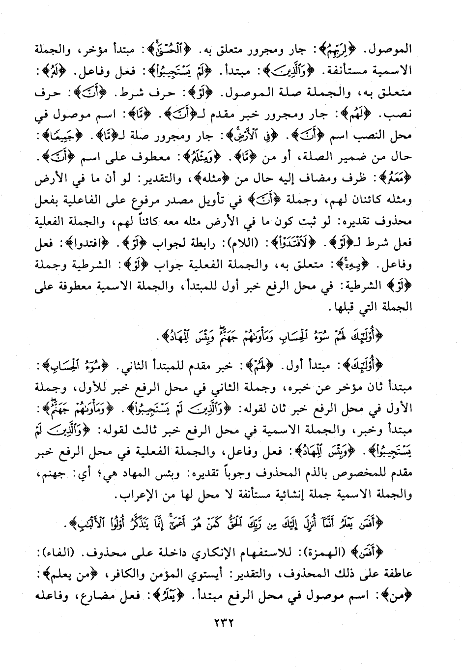 الموصول. {لِرَبِّهِمُ}: جار ومجرور متعلق به. {الْحُسْنَى}: مبتدأ مؤخر، والجملة الاسمية مستأنفة. {وَالَّذِينَ}: مبتدأ. {لَمْ يَسْتَجِيبُوا}: فعل وفاعل. {لَهُ}: متعلق به، والجملة صلة الموصول. {لَوْ}: حرف شرط. {أَنَّ}: حرف نصب. {لَهُم}: جار ومجرور خبر مقدم لـ {أَنَّ}. {مَا}: اسم موصول في محل النصب اسم {أَنَّ}. {فِي الْأَرْضِ}: جار ومجرور صلة لـ {مَا}. {جَمِيعًا}: حال من ضمير الصلة، أو من {مَا}. {وَمِثْلَهُ}: معطوف على اسم {أَنَّ}. {مَعَهُ}: ظرف ومضاف إليه حال من {مثله}، والتقدير: لو أن ما في الأرض ومثله كائنان لهم، وجملة {أَنَّ} في تأويل مصدر مرفوع على الفاعلية بفعل محذوف تقديره: لو ثبت كون ما في الأرض مثله معه كائنًا لهم، والجملة الفعلية فعل شرط لـ {لَوْ}. {لَافْتَدَوْا}: (اللام): رابطة لجواب {لَوْ}. {افتدوا}: فعل وفاعل. {بِهِ}: متعلق به، والجملة الفعلية جواب {لَوْ}: الشرطية وجملة {لَوْ} الشرطية: في محل الرفع خبر أول للمبتدأ، والجملة الاسمية معطوفة على الجملة التي قبلها.
