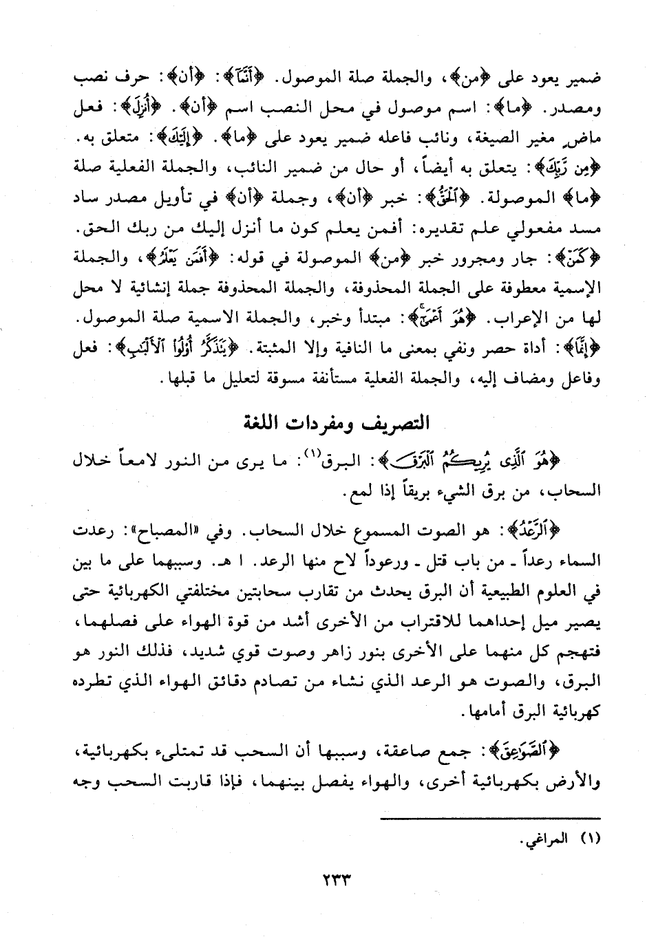 {الرَّعْدُ}: هو الصوت المسموع خلال السحاب. وفي "المصباح": رعدت السماء رعدًا - من باب قتل - ورعودًا لاح منها الرعد. اهـ. وسببهما على ما بين في العلوم الطبيعية أن البرق يحدث من تقارب سحابتين مختلفتي الكهربائية حتى يصير ميل إحداهما للاقتراب من الأخرى أشد من قوة الهواء على فصلهما، فتهجم كل منهما على الأخرى بنور زاهر وصوت قوي شديد، فذلك النور هو البرق، والصوت هو الرعد الذي نشاء من تصادم دقائق الهواء الذي تطرده كهربائية البرق أمامها.