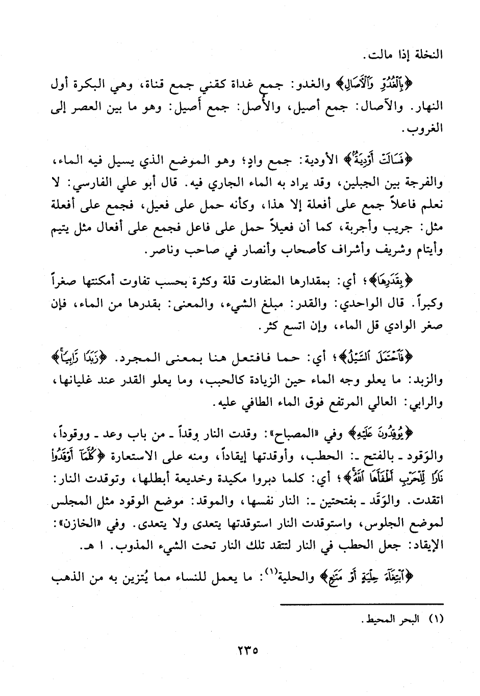 {فَاحْتَمَلَ السَّيْلُ}؛ أي: حما فافتعل هنا بمعنى المجرد. {زَبَدًا رَابِيًا} والزبد: ما يعلو وجه الماء حين الزيادة كالحبب، وما يعلو القدر عند غليانها، والرابي: العالي المرتفع فوق الماء الطافي عليه.