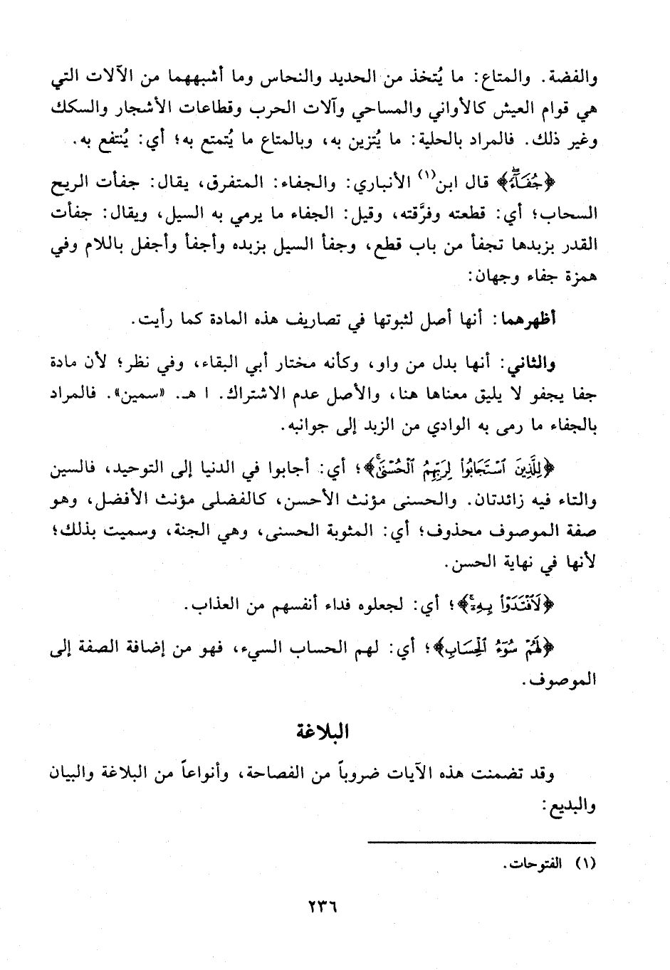 {جُفَاءً} قال ابن (¬1) الأنباري: والجفا: المتفرق، يقال: جفأت الريح السحاب؛ أي: قطعته وفرَّقته، وقيل: الجفاء ما يرمي به السيل، ويقال: جفأت القدر بزبدها تجفأ من باب قطع، وجفأ السيل بزبده وأجفأ وأجفل باللام وفي همزة جفاء وجهان: