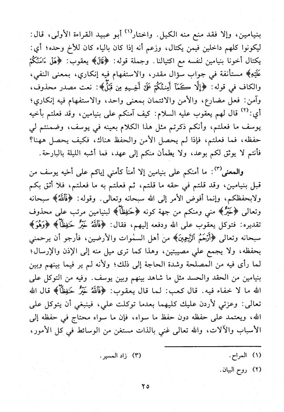 والمعنى (¬3): ما أمنكم علي بنيامين إلا أمنًا كأمني إياكم على أخيه يوسف من قبل بنيامين، وقد قلتم في حقه ما قلتم، ثم فعلتم به ما فعلتم، فلا أثق بكم ولا بحفظكم، وإنما أفوض الأمر إلى الله سبحانه وتعالى. وقوله: {فَاللَّهُ} سبحانه وتعالي {خَيْرٌ} مني ومنكم من جهة كونه {حَافِظًا} لبنيامين مرتب على محذوف تقديره: فتوكل يعقوب على الله ودفعه إليهم، فقال: {فَاللَّهُ خَيْرٌ حَافِظًا} {وَهُوَ} سبحانه وتعالى {أَرْحَمُ الرَّاحِمِينَ} من أهل السموات والأرضين، فأرجو أن يرحمني بحفظه، ولا يجمع علي مصيبتين، وهذا كما ترى ميل منه إلى الإذن والإرسال؛ لما رأى فيه من المصلحة وشدة الحاجة إلى ذلك؛ ولأنه لم ير فيما بينهم وبين بنيامين من الحقد والحسد مثل ما شاهد بينهم وبين يوسف. وفيه من التوكل على الله ما لا خفاء فيه. قال كعب: لما قال يعقوب: {فَاللَّهُ خَيْرٌ حَافِظًا} قال الله تعالى: وعزتي لأردن عليك كليهما بعدما توكلت علي، فينبغي أن يتوكل على الله، ويعتمد على حفظه دون حفظ ما سواه، فإن ما سواه محتاج في حفظه إلى الأسباب والآلات، والله تعالى غني بالذات مستغن من الوسائط في كل الأمور،