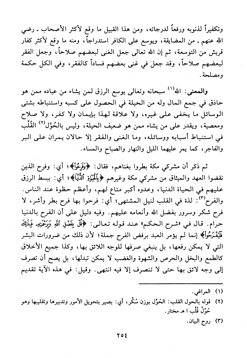 والمعنى: الله (¬1) سبحانه وتعالى يوسع الرزق لمن يشاء من عباده ممن هو حاذق في جمع المال وله من الحيلة في الحصول على كسبه واستنباطه بشتى الوسائل ما يخفى على غيره، ولا علاقة لهذا بإيمان ولا كفر، ولا صلاح ومعصية، ويقدر على من يشاء ممن هو ضعيف الحيلة، وليس بالحُوَّل (¬2) القُلَّب في استنباط أسبابه ووسائله، وما الغنى والفقر إلا حالان يمران على البر والفاجر، كما يمر عليهما الليل والنهار والصباح والمساء.